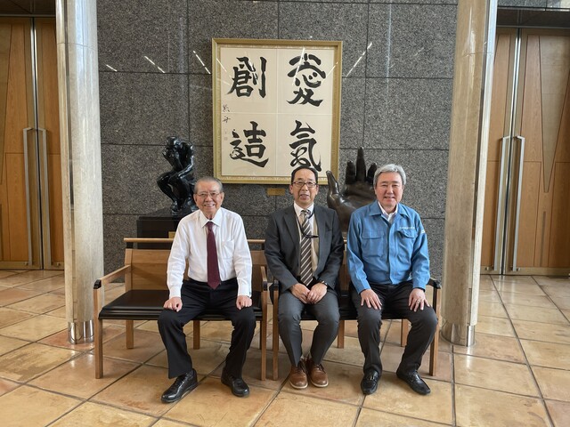 3月26日 学長は、和歌山大学経営協議会委員である株式会社島精機製作所の島三博社長ならびに島正博名誉会長を訪問し、本学の経営等について意見交換を行いました。島三博社長におかれましては、今年度をもって経営協議会委員としてのご任務を終えられることとなりました。これまでの多大なるご尽力に深く感謝申し上げるとともに、今後とも本学への変わらぬご支援を賜りますようお願い申し上げました。