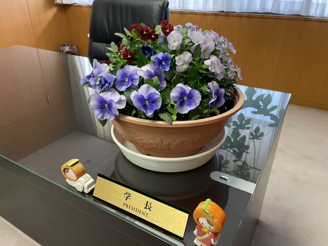 1月16日 特別支援学校の生徒さんがつくった寄せ植えが学長室に届けられました。おかげで学長室が明るく彩られています。すてきな贈り物をありがとうございます。