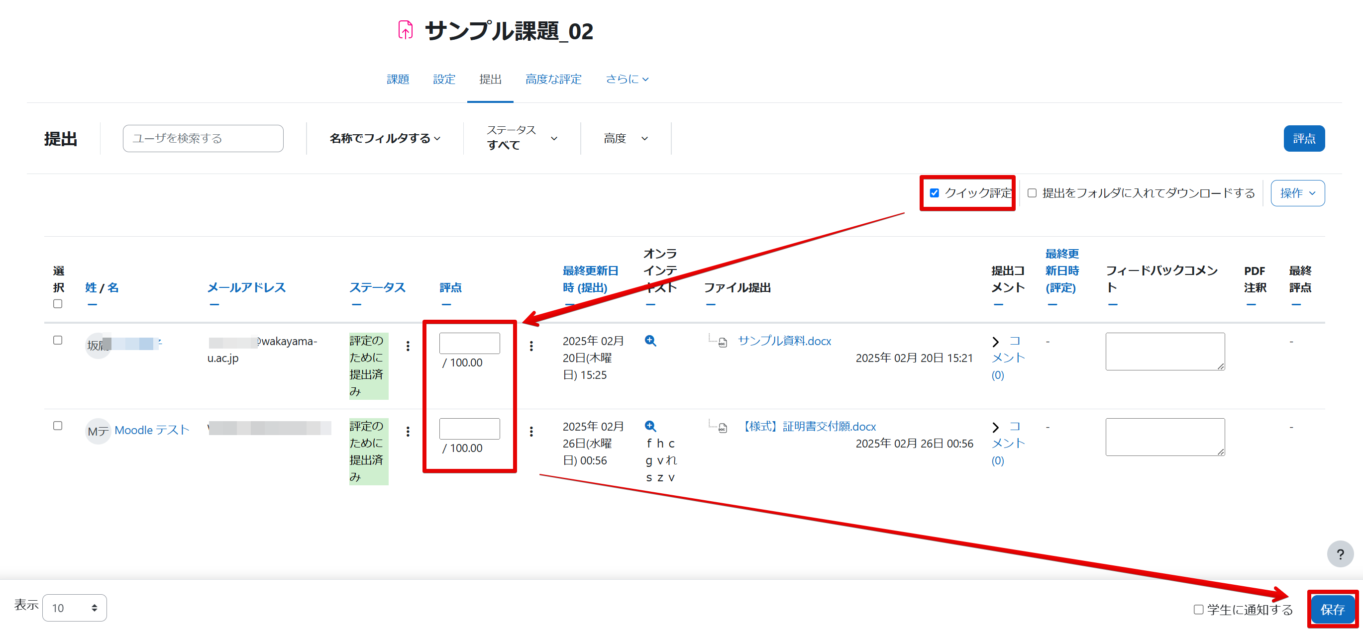 ②「クイック評定」にチェックを入れ、評点欄に点数を入力する。