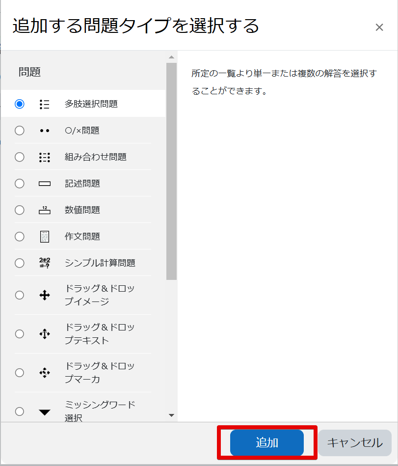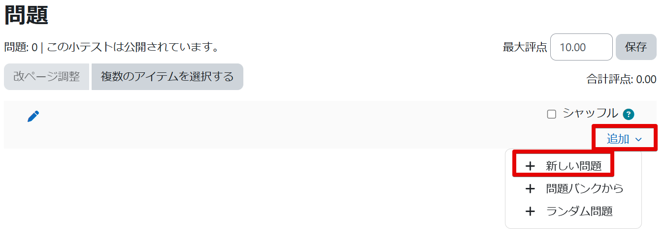 ②項目右下の「追加」から「新しい問題」を選択し、追加してください。