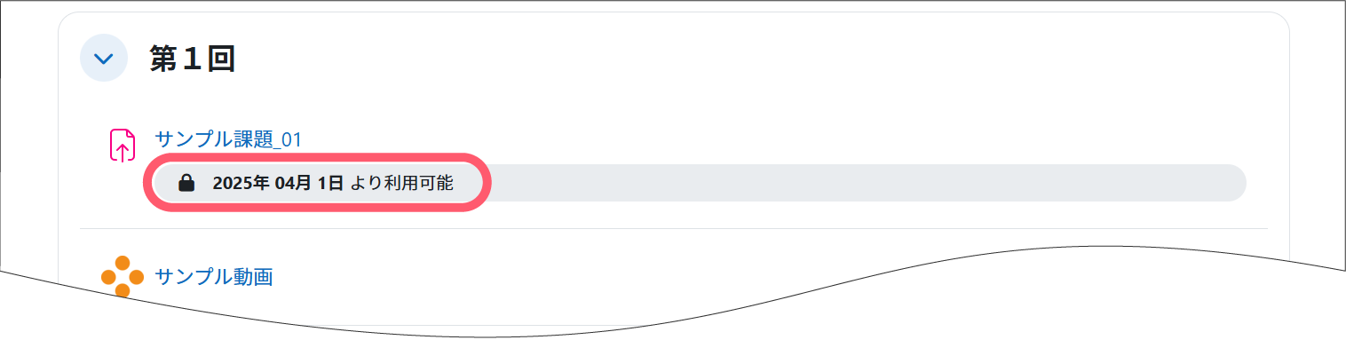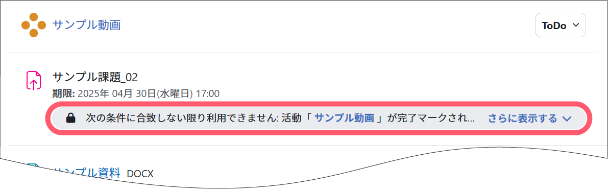 例 下記の場合「 サンプル動画 」を視聴しないと課題が提出できません。