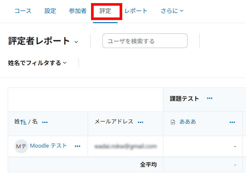 ①該当コースにアクセスし、タブ内から評定をクリックします。