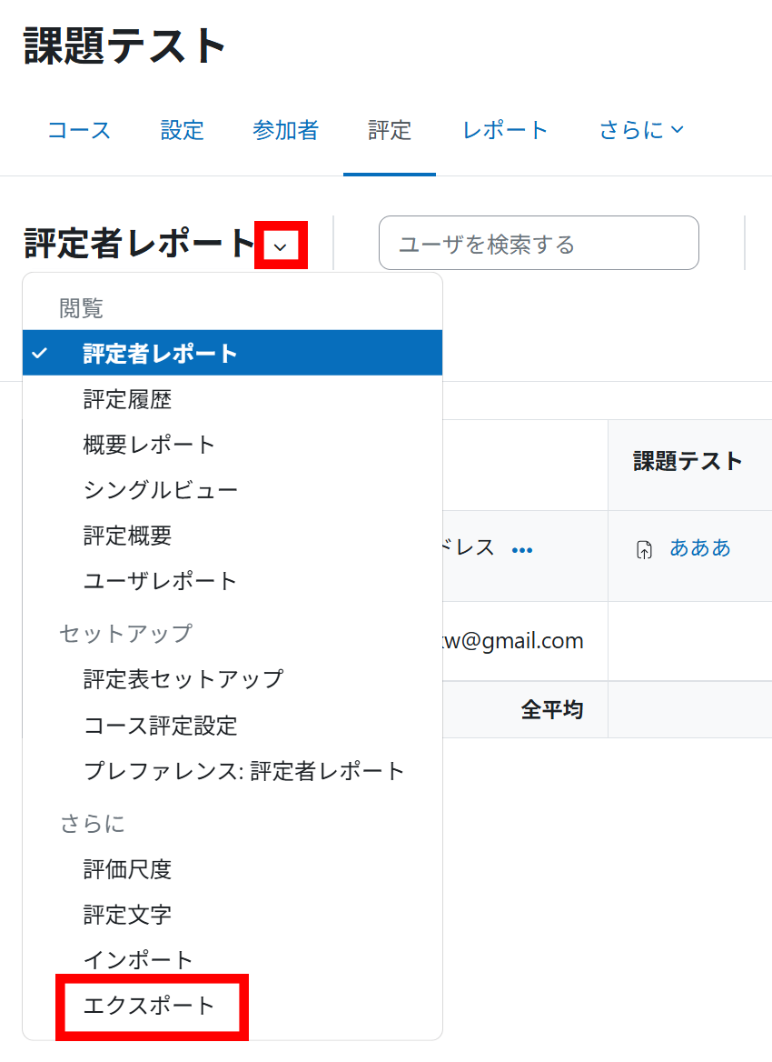 ①評定の確認ページにアクセス、評定者レポート右の↓マークをクリックし、さらにの中のエクスポートw選択します。