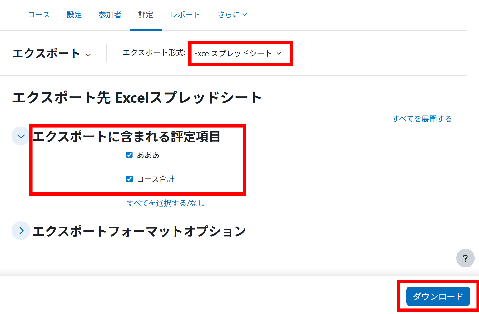 ②エクスポート形式をExcelスプレッドシートに変更し、出力したい項目を選択してからダウンロードをクリックします。
