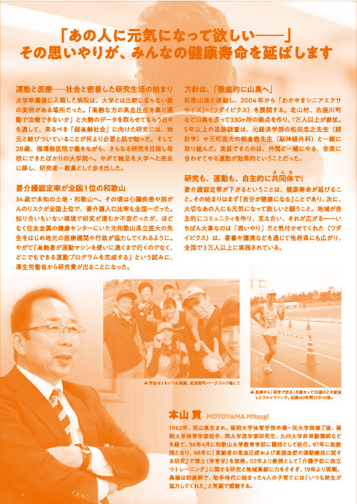 34歳で未知の土地・和歌山へ。その頃は心臓疾患や肺がんのリスクが全国上位で、要介護人口比率も全国一だった。知り合いもいない環境で研究が進むか不安だったが、ほどなく住友金属の健康センターにいた元和歌山県立医大の先生をはじめ地元の医療機関や行政が協力してくれるように。やがて「高齢者が運動マシンを使いに遠くまで行くのでなく、どこでもできるプログラムを完成する」という試みに、厚生労働省から研究費が出ることになった。
