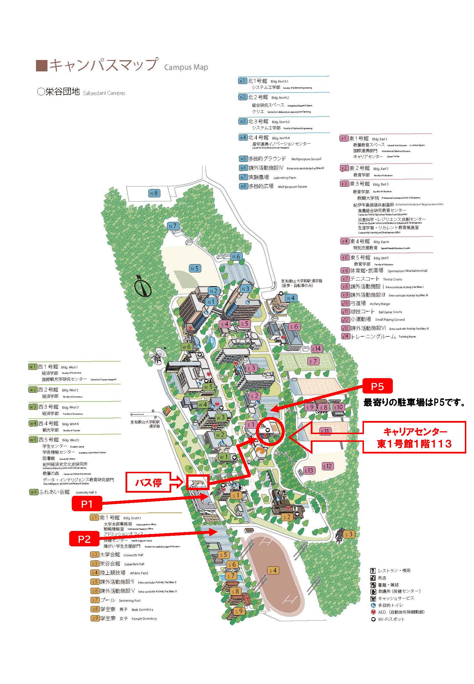 キャリアセンター最寄りの駐車場は「P5」でございますが、授業期間中はほとんど満車になっておりますので、ゲート付近の比較的空きのある「P1」「P2」をご利用ください。
