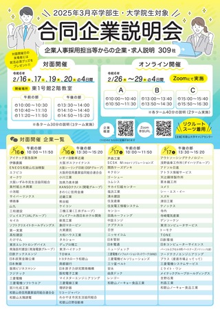 公開日 2024年01月17日 令和5年度「和歌山大学合同企業説明会」を対面形式及びオンライン形式で開催します。 2025年卒の学生の皆さんには教育サポートシステムによりお知らせしています。 また、和歌山大学Moodle2023>コース名「就職支援2023」にも情報を掲載しています。 ※画像をクリックすると印刷用PDFが開きます お問い合わせ 事務局 学務課 キャリア支援係