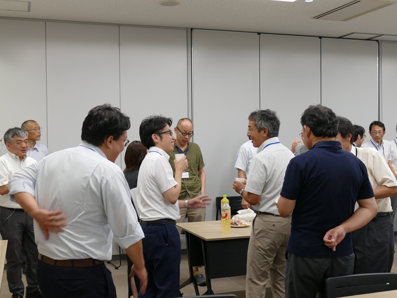 その後、交流会を行いました。飲み物とお菓子を囲んで、企業の方も研究者も活発に会話を交わしていました。