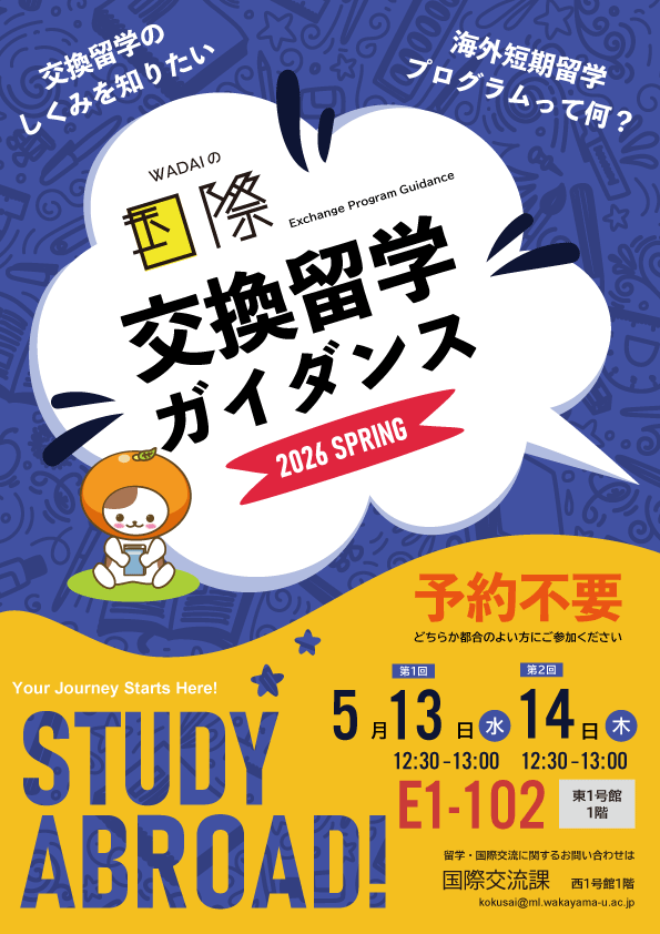 下記の日程で、和歌山大学の交換留学制度、海外短期留学プログラムについての説明会を実施します。