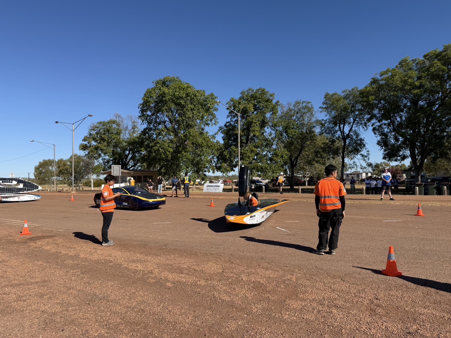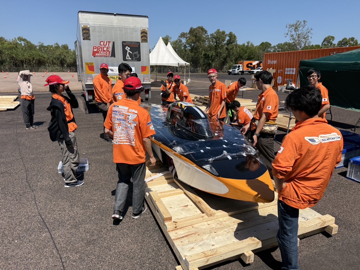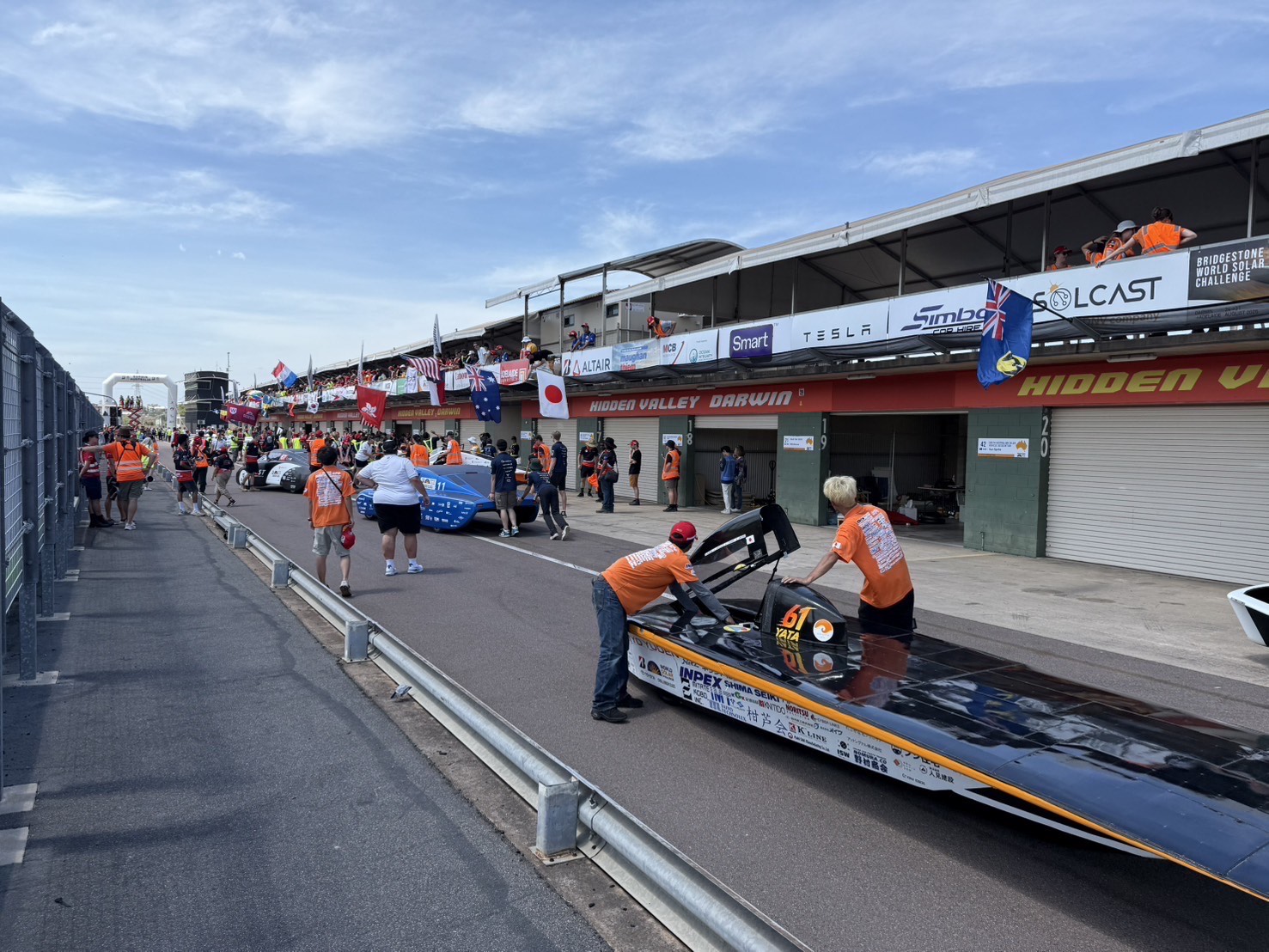 本日、無事にダーウィンへ到着しました。 レースでのスタート地点を下見に行ったのち、大会本部が設置されるヒドゥンバレー・レースウェイへも向かいました。 私たちのチームはまだソーラーカーを輸送業者から受け取れておらず、ピットの割当てを受けられていませんが、多くのチームが続々とソーラーカーを搬入し、ピット設営を進めていました。 海洋コンテナを丸ごとサーキットまで運び入れてるチームなどもあり、学生は他チームのソーラーカーを見学しながら、いよいよ始まるんだなと期待に胸を膨らませていました。