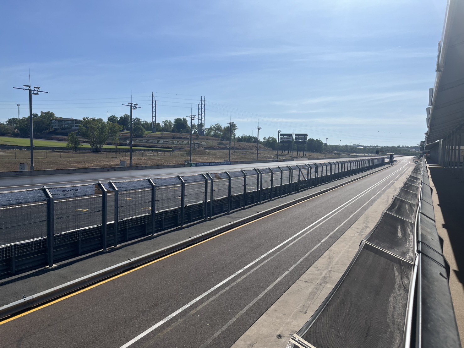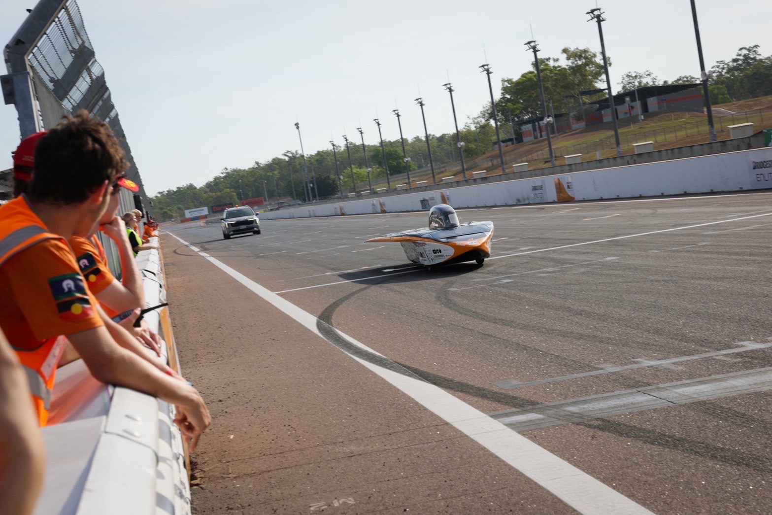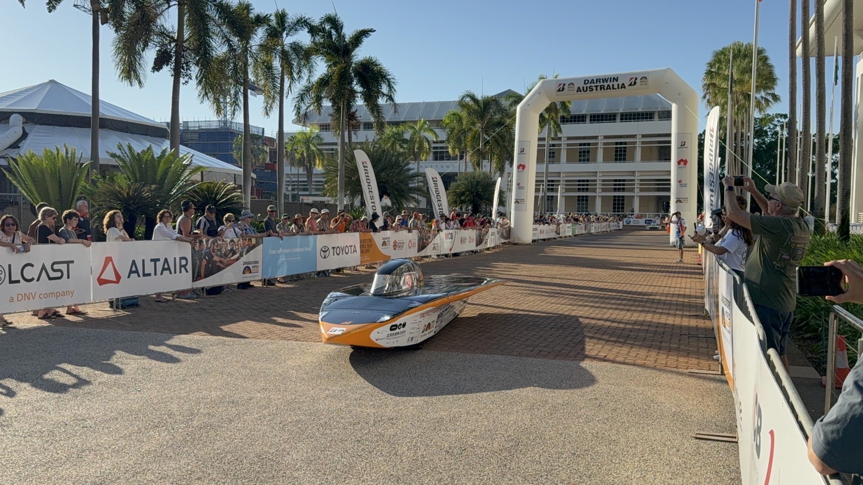 本日、無事にダーウィンへ到着しました。 レースでのスタート地点を下見に行ったのち、大会本部が設置されるヒドゥンバレー・レースウェイへも向かいました。 私たちのチームはまだソーラーカーを輸送業者から受け取れておらず、ピットの割当てを受けられていませんが、多くのチームが続々とソーラーカーを搬入し、ピット設営を進めていました。 海洋コンテナを丸ごとサーキットまで運び入れてるチームなどもあり、学生は他チームのソーラーカーを見学しながら、いよいよ始まるんだなと期待に胸を膨らませていました。