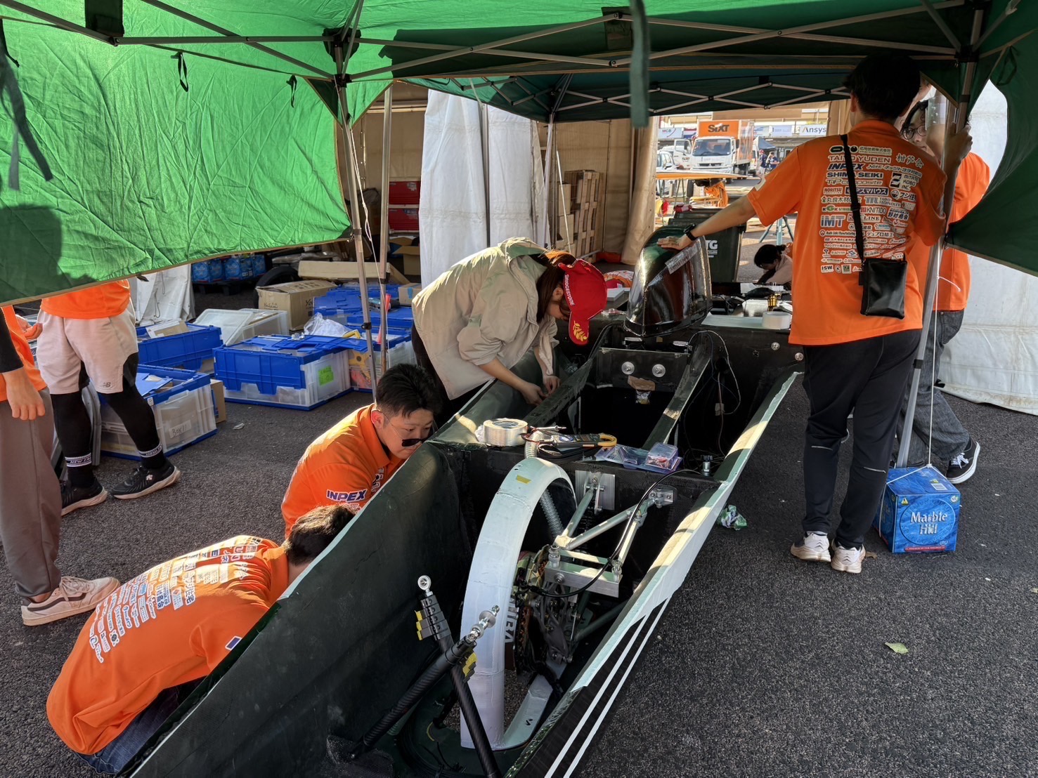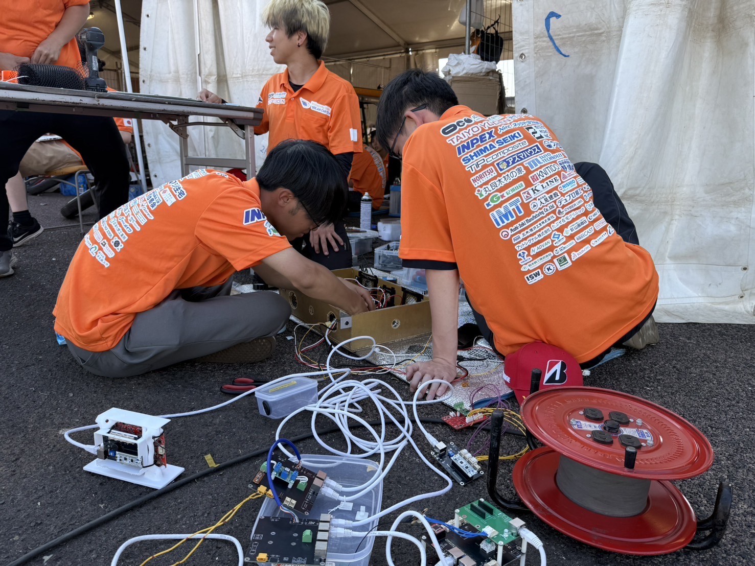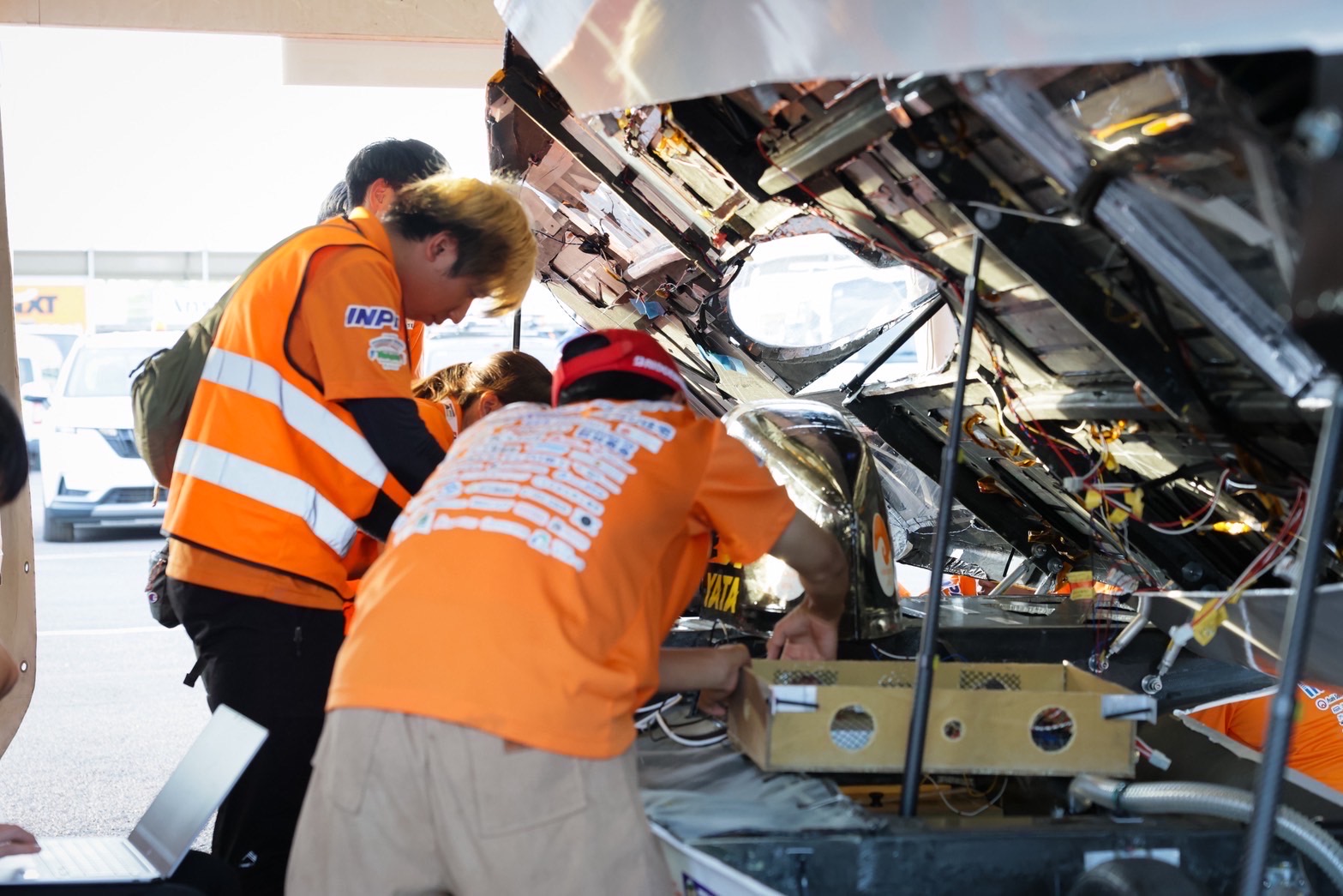 サーキットでの走行試験でソーラーカーがコースアウトするトラブルがあり、足回りに軽微な損傷が見られたため、補修のための作業方針の確認や、必要な資材の調達もおこないました。 学生に同行しているサポートスタッフたちのアドバイスのもと、学生が懸命に作業に取り組んでいます。