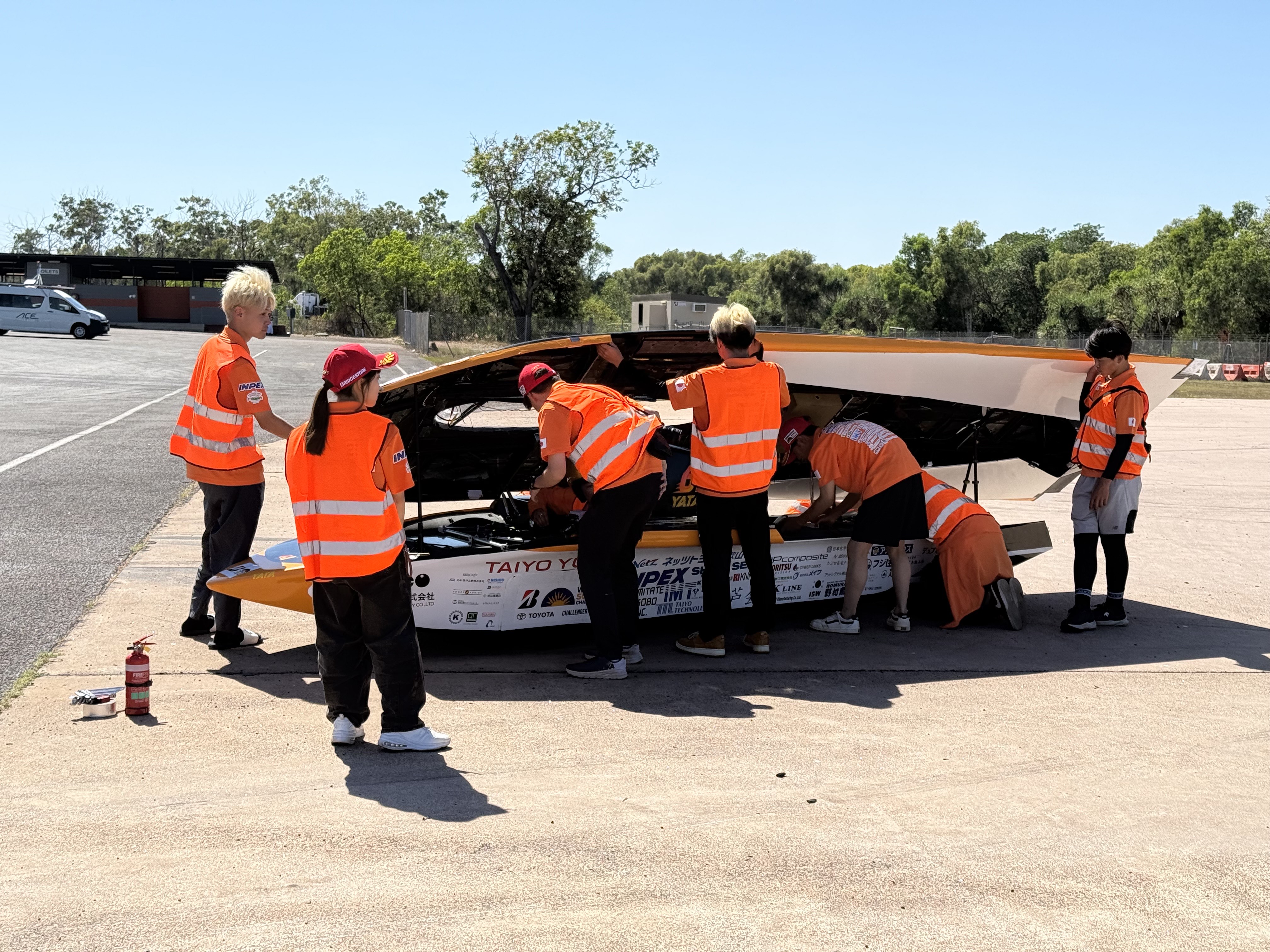 本日も引き続き、ソーラーカーの整備作業をおこないました。 サーキットが開場する朝7時から最大限に限られた時間を使って作業を進めています。 私たちのソーラーカーも到着したことで、他チームの見学も増えており、質問に英語で答えたりする友好交流が多くなりました。