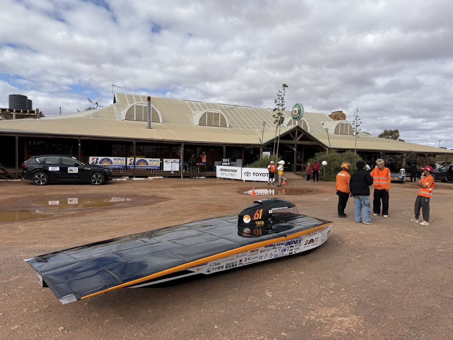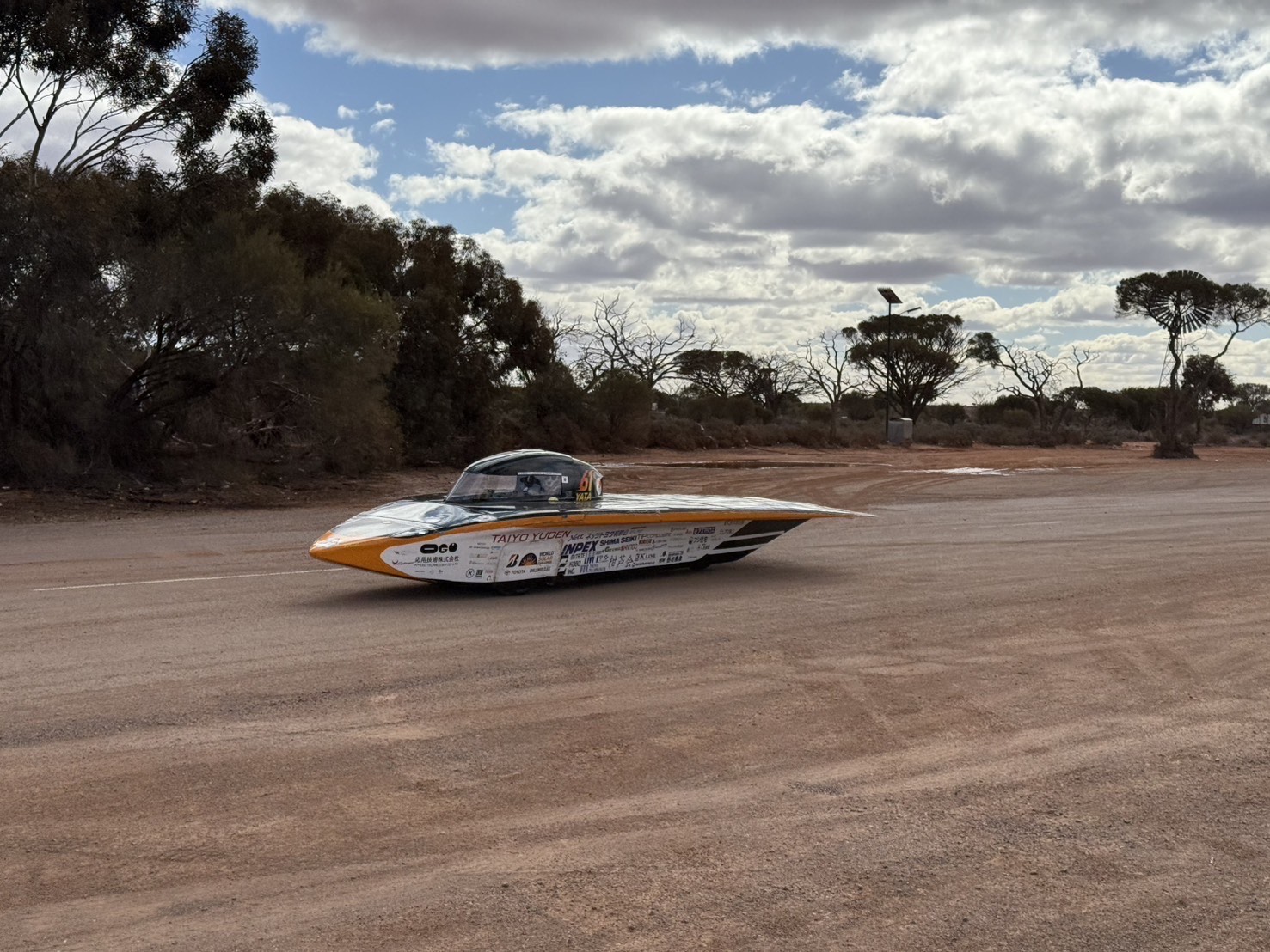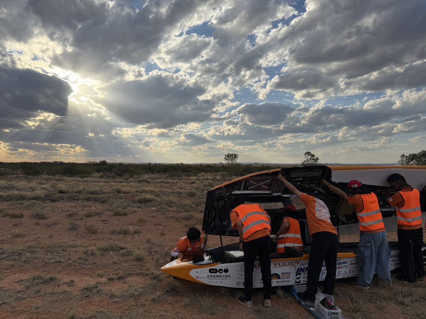 前回大会ではソーラーパネルの発電不良に悩まされましたが、今回は計画を上回る発電量を維持できており、その分少しペースを上げて快調に走行しています。 途中、タイヤを覆うボディ部品が外れてしまうトラブルがあり、短時間の停車をしましたが、それ以外は大きなトラブルもなく順調に走行できました。 本日はダーウィンから535km地点まで到達し、1日目の走行を終えました。 夜は軽くメンテナンスをおこない、2日目の走行に備えます。