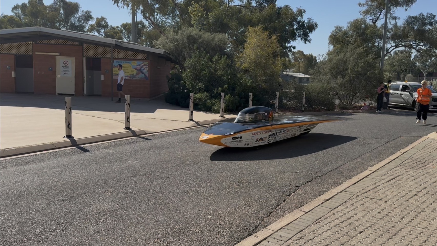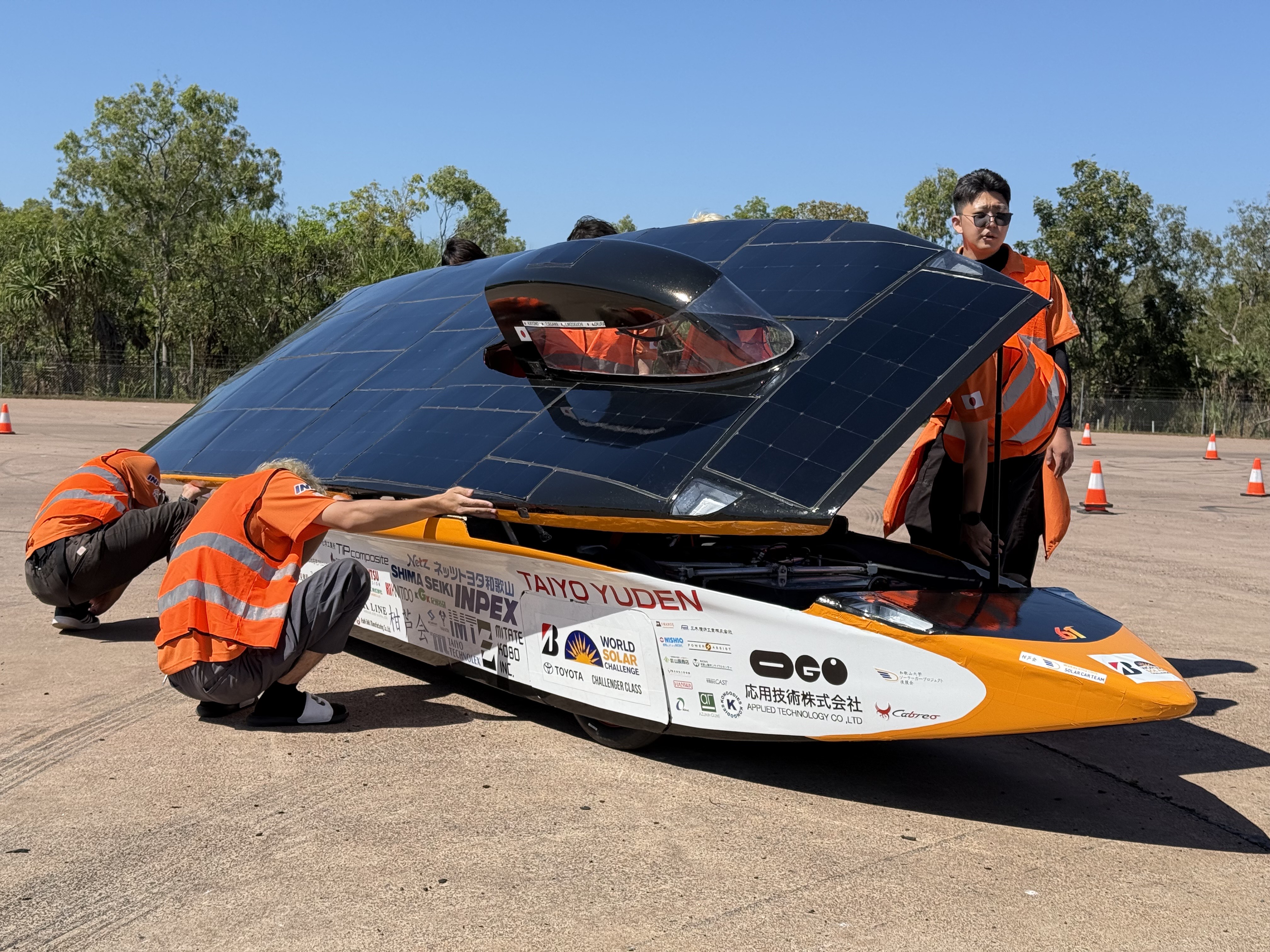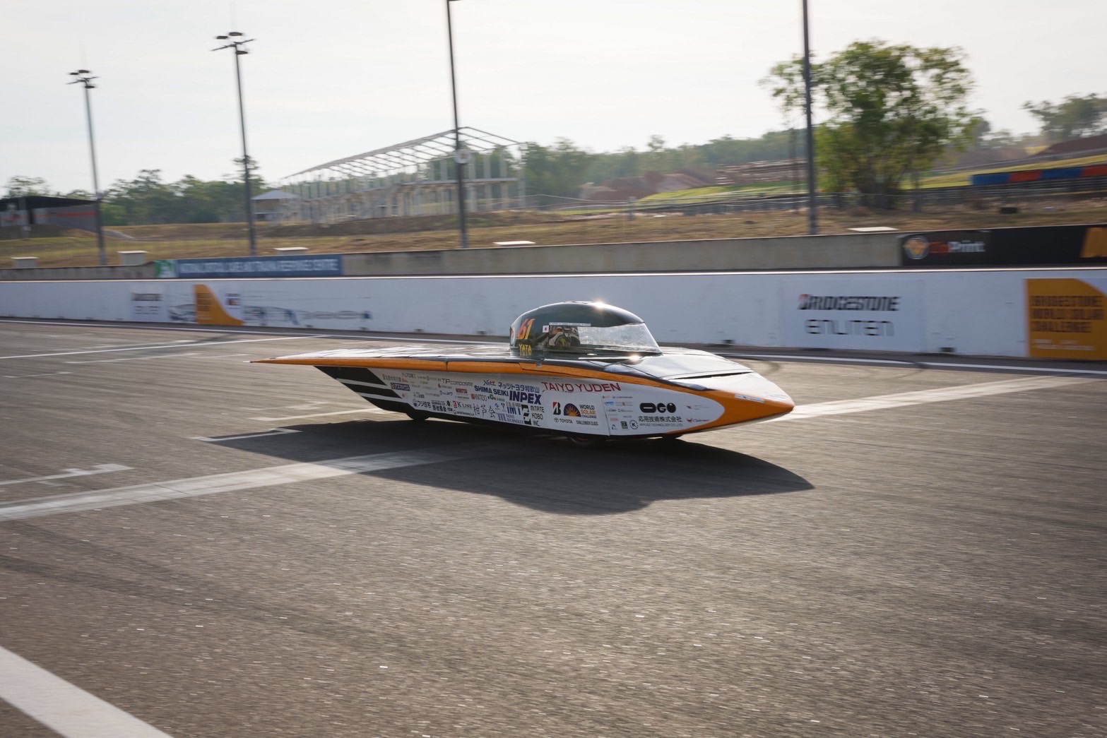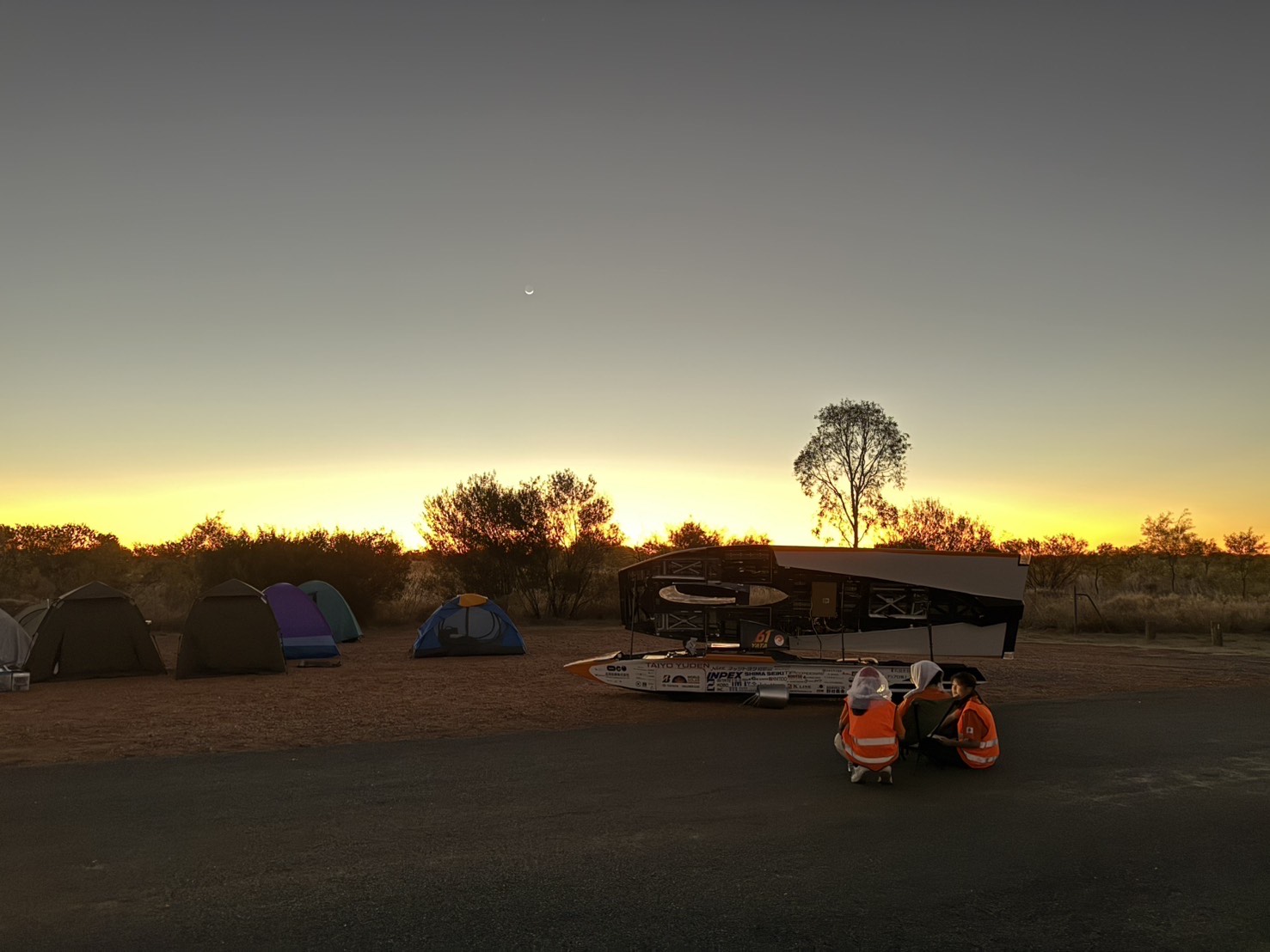 前回大会ではソーラーパネルの発電不良に悩まされましたが、今回は計画を上回る発電量を維持できており、その分少しペースを上げて快調に走行しています。 途中、タイヤを覆うボディ部品が外れてしまうトラブルがあり、短時間の停車をしましたが、それ以外は大きなトラブルもなく順調に走行できました。 本日はダーウィンから535km地点まで到達し、1日目の走行を終えました。 夜は軽くメンテナンスをおこない、2日目の走行に備えます。