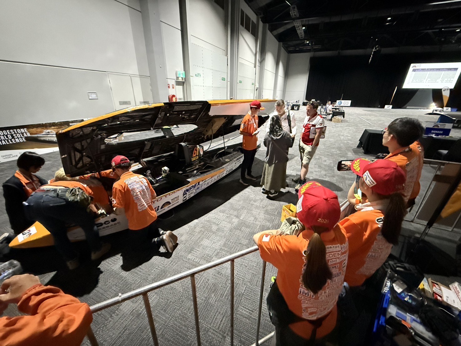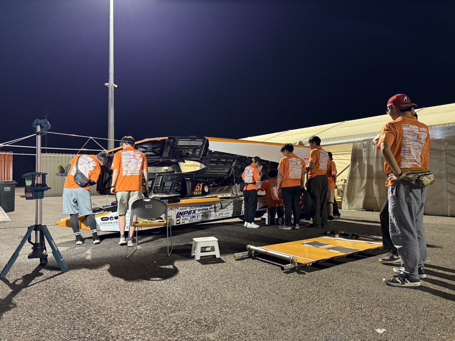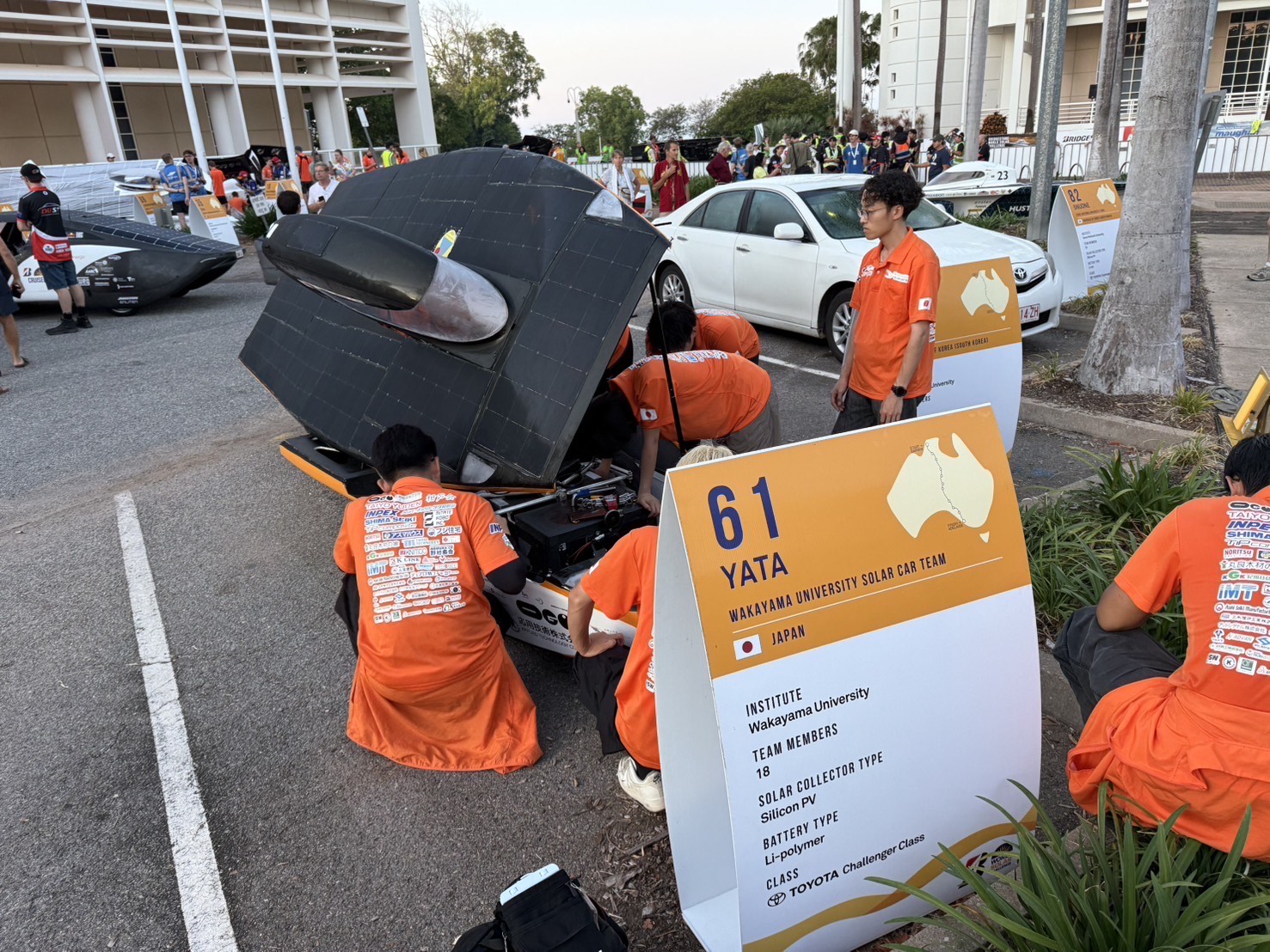 検疫の順番待ちなどでこちらでソーラーカーを受け取れるまでに時間がかかりましたが、損傷もなく無事にソーラーカーが届いたことに学生たちも喜んでいました。 さっそく車検に向けたソーラーカーの仕上げに取り掛かり、万全の準備で車検、そしてレース本戦に挑むべく急ピッチの作業が始まりました。他チームが本日の作業が終わり宿に帰り始めるなか、和歌山大学チームはもう一踏ん張りです。