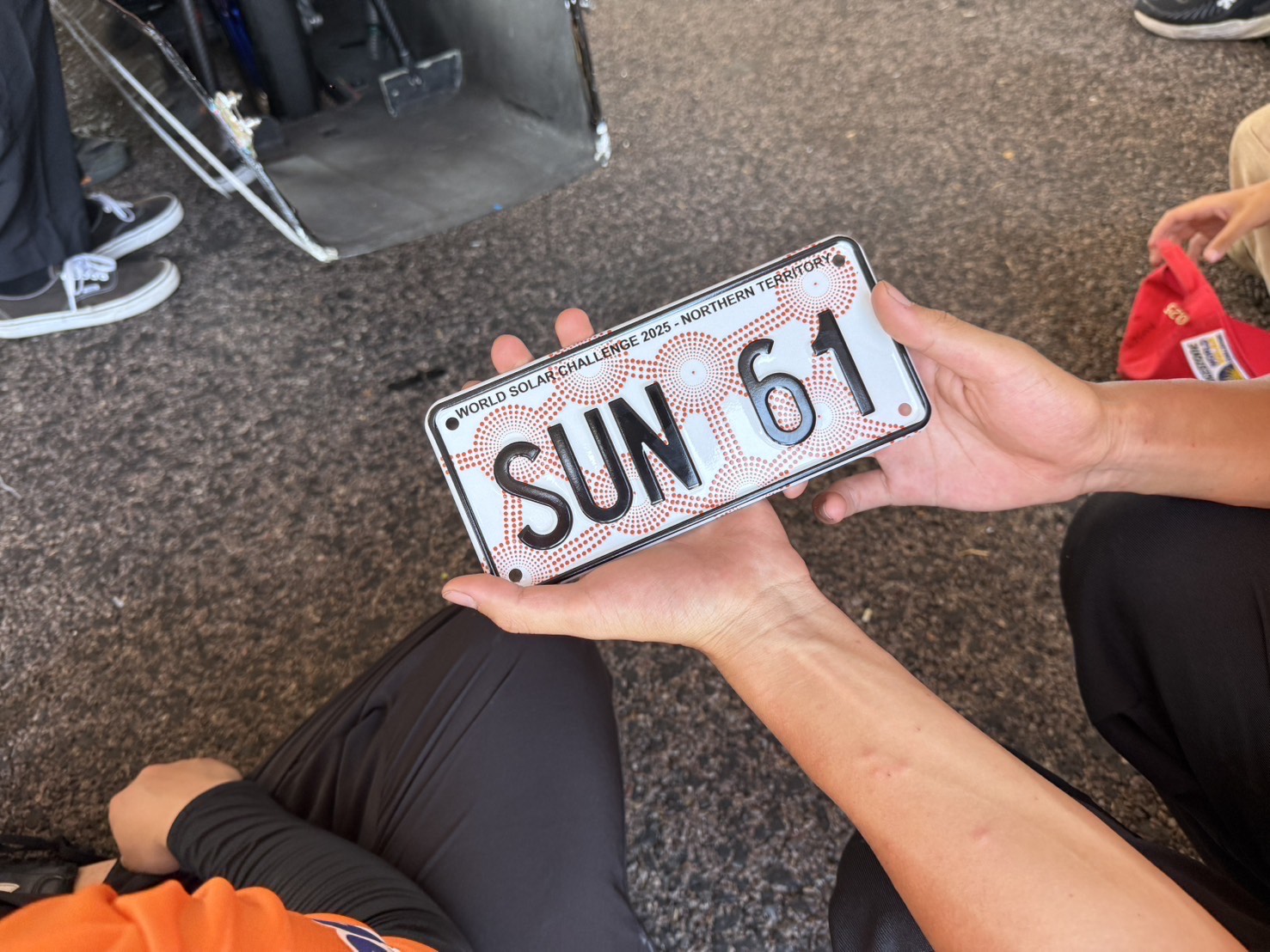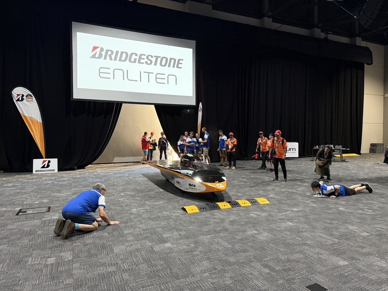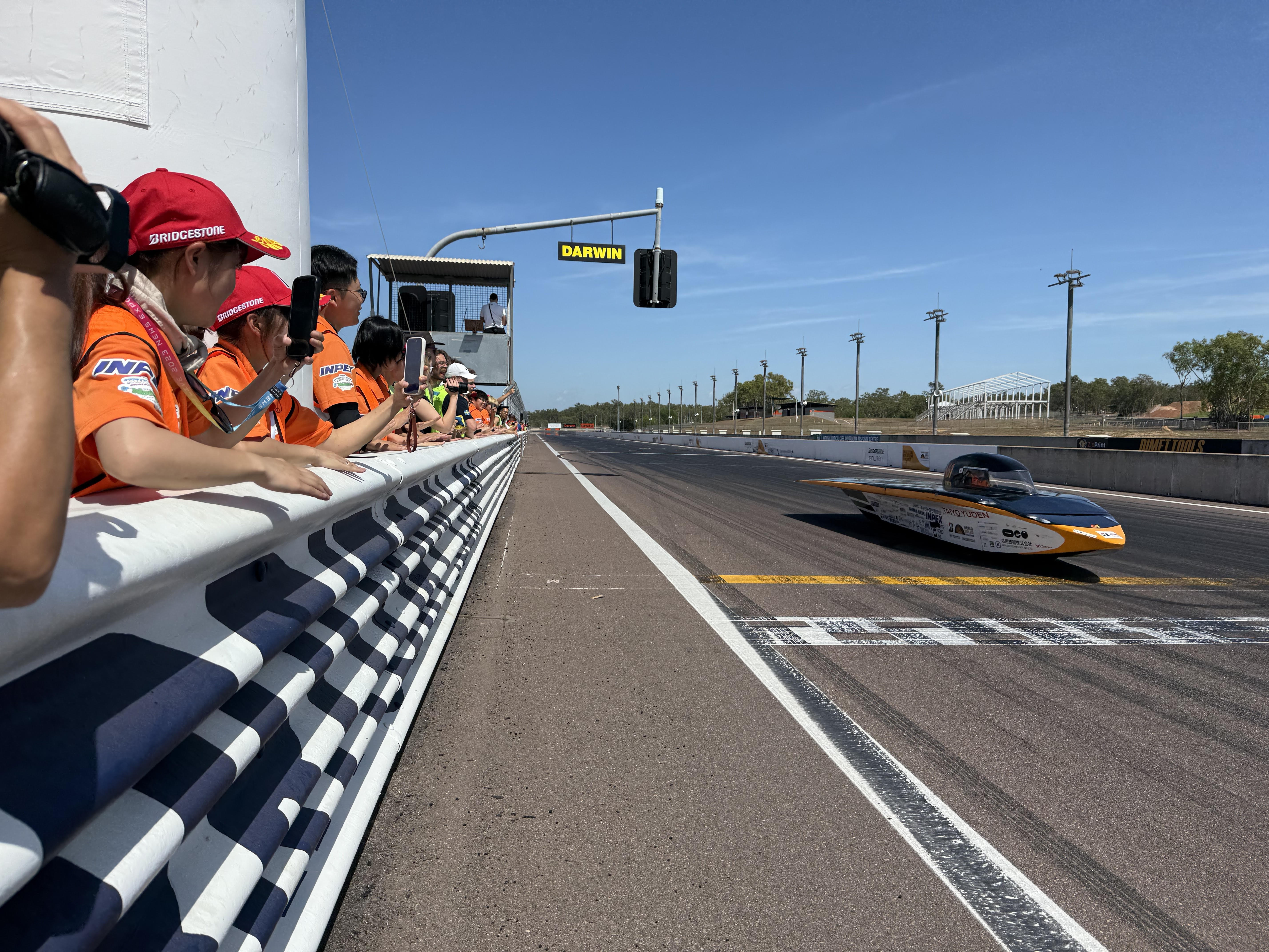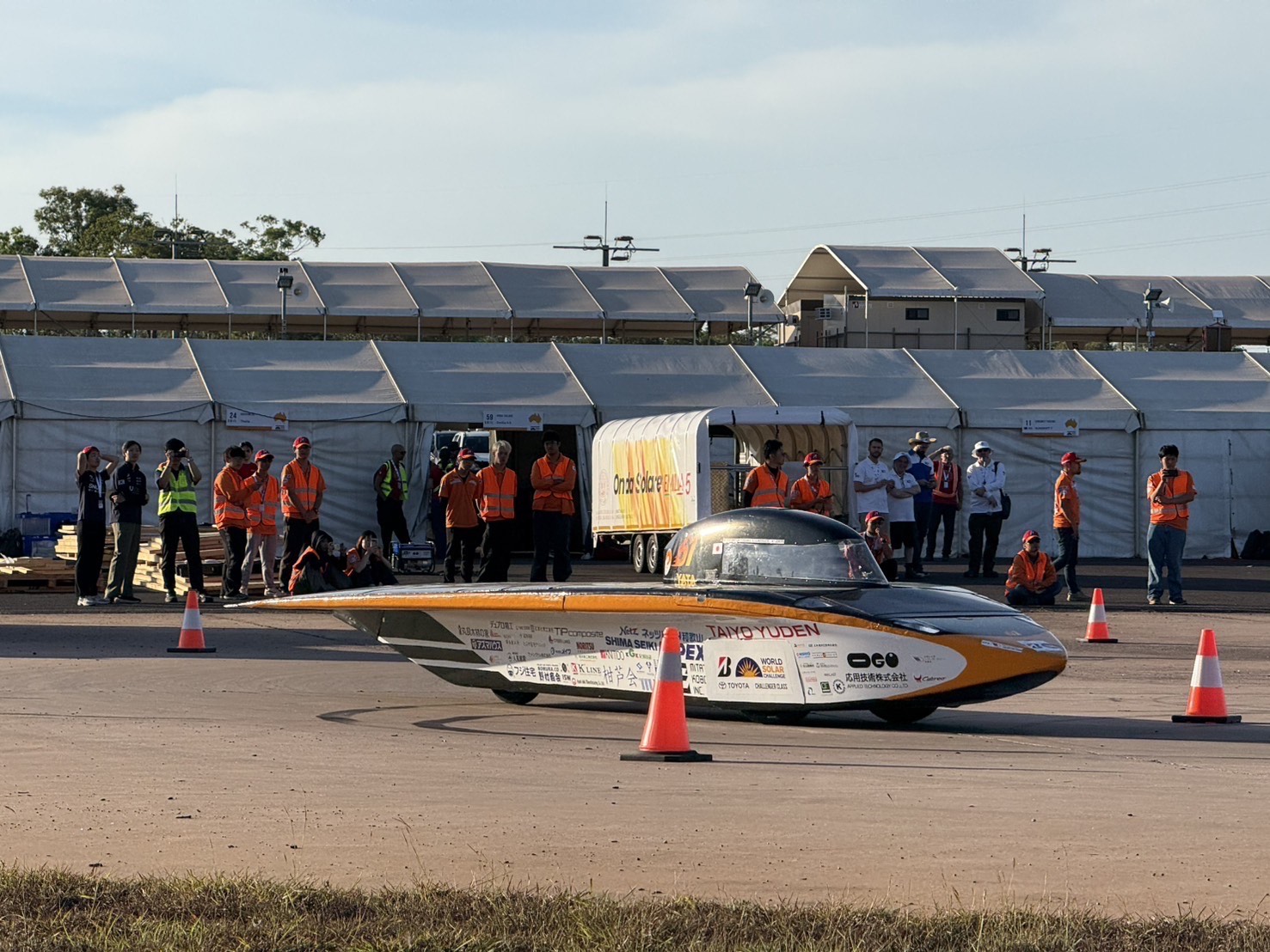 本日は実際にソーラーカーを走らせて性能を確認する動的車検を受けました。 サーキットを1周走ってタイムを計測し、その後スラローム走行とブレーキの制動距離をテストするものです。 これらのテストに一発合格し、車検項目がすべて合格となったことから、オーストラリアの公道で走るためのナンバープレートの交付を受け、無事に大会への参加が認められました。 明日は朝8時にレーススタートで、いよいよ3000kmのレースの旅路が始まります。 リアルタイムの走行位置はこちらのサイトから見れますので、ぜひ日本からもご声援よろしくお願いします。