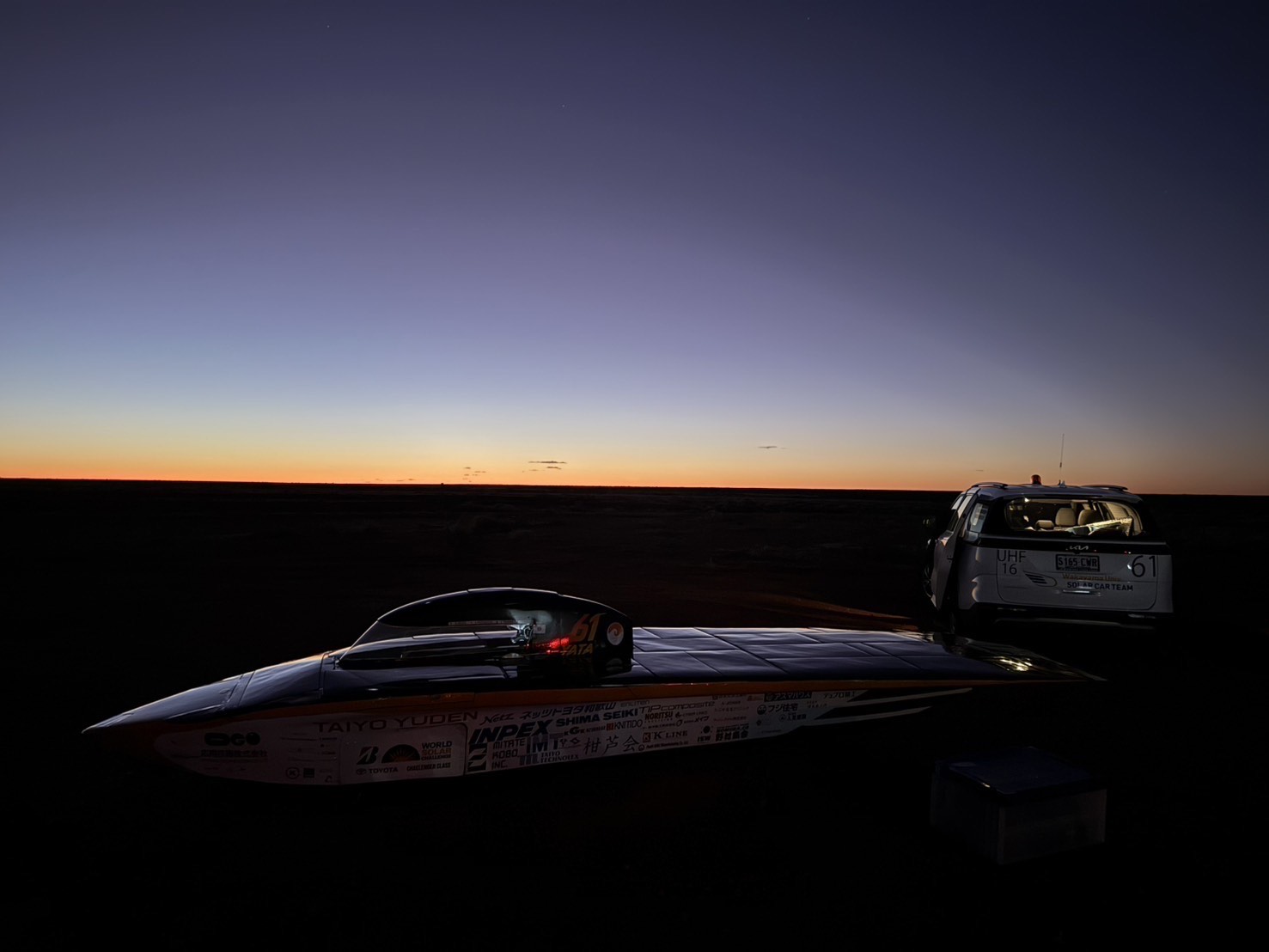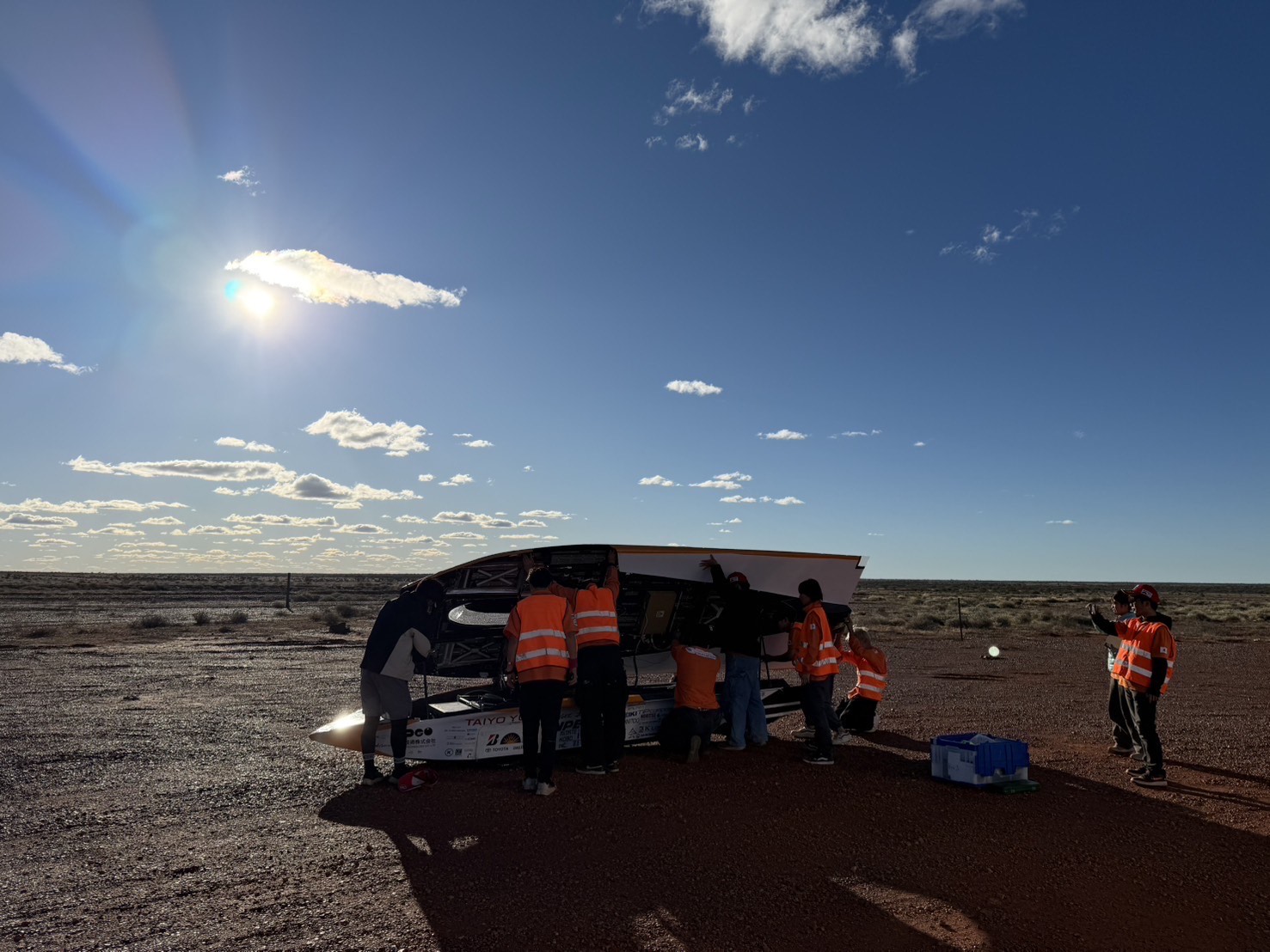 本日も大きなトラブルもなく順調に走行を続けることができ、約2560km地点まで到達しました。ゴールまで残り470kmです。 朝からは太陽の傾いている時間にソーラーパネルを太陽の方向に向けて最大限充電することにしたため30分遅れてのスタートでした。 道中、タイヤを覆うボディが脱落するトラブルはありましたが、短時間で修復し、計画通りの走行をすることができました。 車体のコンディション、ポテンシャル、レースペース、バッテリーの残量、どれをとっても充分完走を狙える状態です。 しかし、明日の天気予報は道中が曇り、ゴールのアデレードでは大雨の予報になっています。そのため、余談を許さない状況です。 明日もたくさんの太陽光を受けられることを願いながら、ソーラーカーの整備と走行計画の再計算を行っています。