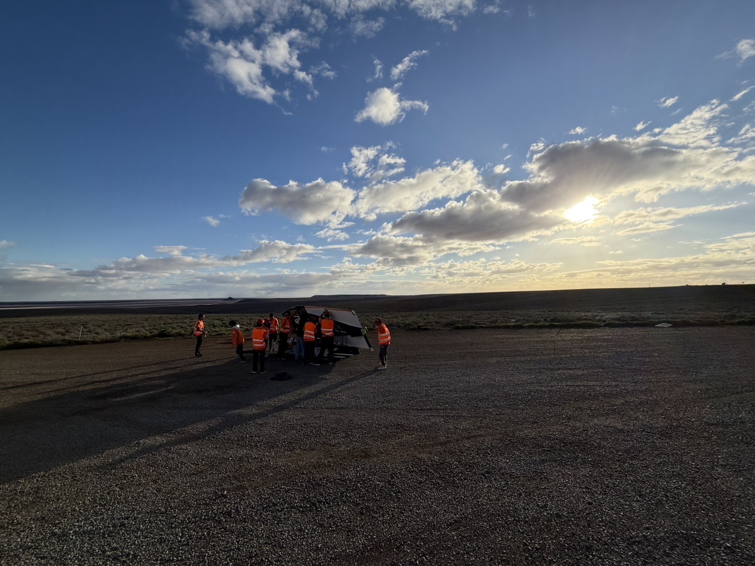 本日は中間地点のアリススプリングスを超えて、ダーウィンから約1600km地点まで到達しました。 モーターを最高出力にしても予定していた速度まで到達しない問題が起きていますが、計画している走行ペース的には問題ありません。順調に走行を続けています。 アリススプリングスから先は、平均して下り坂になるため、電力収支に余裕がでる計算でしたが、午後からは雲が増えてきて思うように発電ができず、バッテリーを多く使ってしまう結果になりました。 明日は晴れ予報ではありますが、学生たちは油断せずに、走行終了後も風が強い中、雲の切れ間を探してソーラーパネルによる充電を続けてました。
