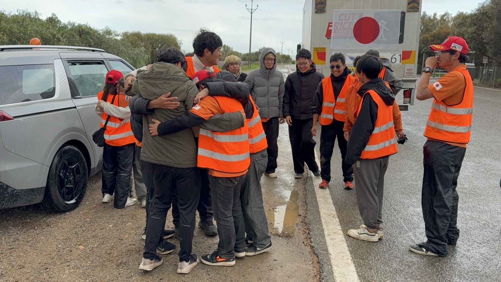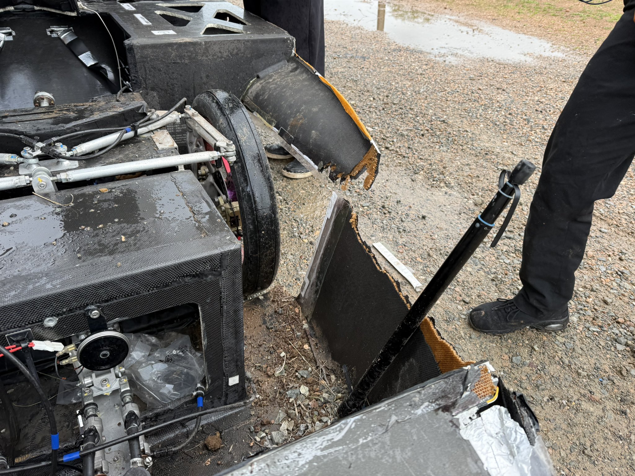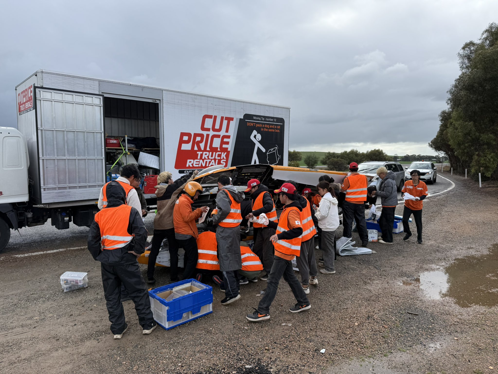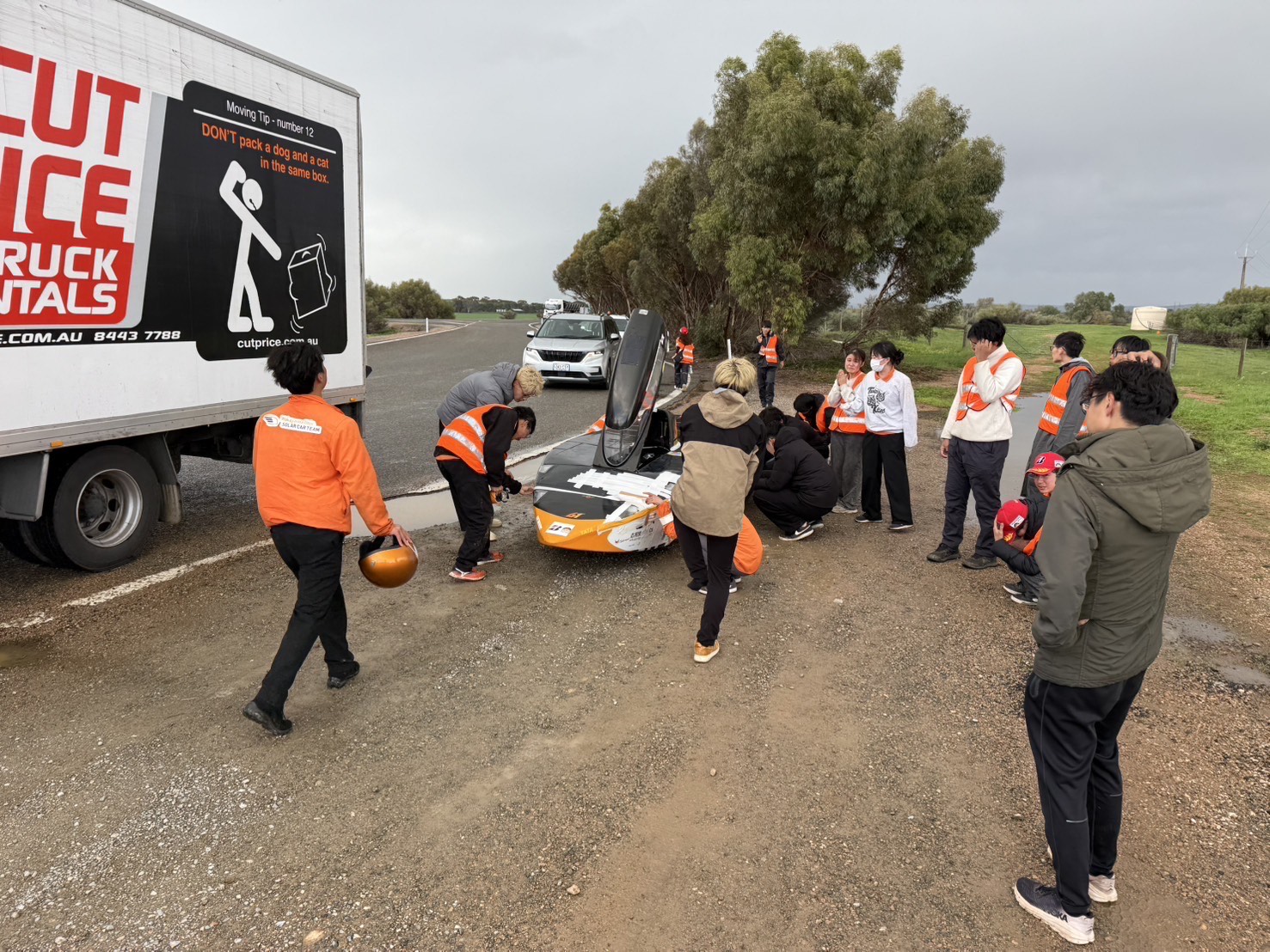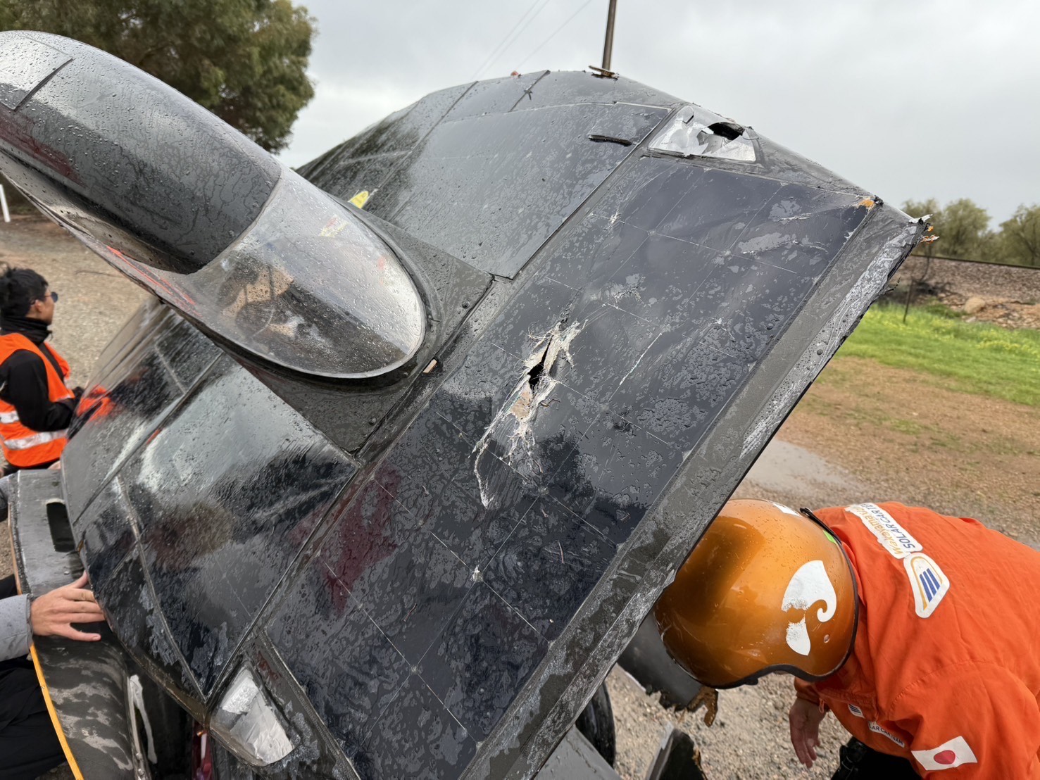 あとはゴールのアデレードを目指すだけというところ、アデレードから約200km手前の地点で強い横風に煽られて路肩に飛ばされ、車体のボディが大きく破損してしまいました。 車体構造には損傷はなかったため、学生たちが大雨の中で急ピッチの修復作業をおこないましたが、大会運営から、天候、ゴールまでの距離、車体の損傷を総合的に判断して走行を終了するように指示を受けました。 車体に安全上の問題がないことを説明し、どこまで走れるかのチャレンジをしたいと交渉しましたが、判断は覆りませんでした。 結果、2831km地点にて今回のレースは幕を閉じることになりました。