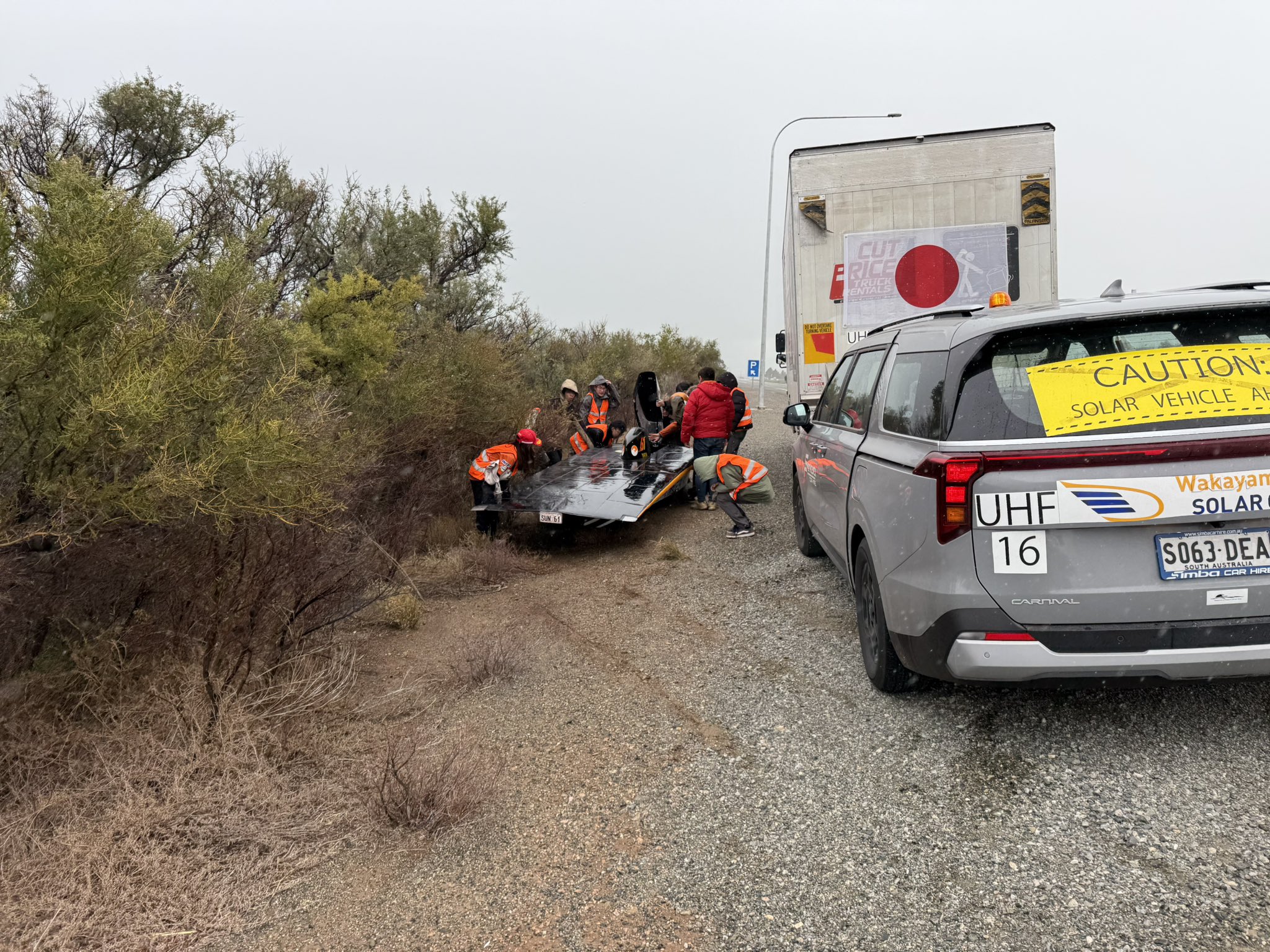 本日はゴールのアデレードを到達目標とし、最終日の走行をスタートしました。 アデレードに近づくにつれて天候が悪くなることが予想されていたため、スタートを30分遅らせてバッテリーの充電をおこなってから出走する予定でしたが、気象警報が出ている影響で大会運営から全車両走行中止の指示を受け、45分遅れてのスタートになりました。