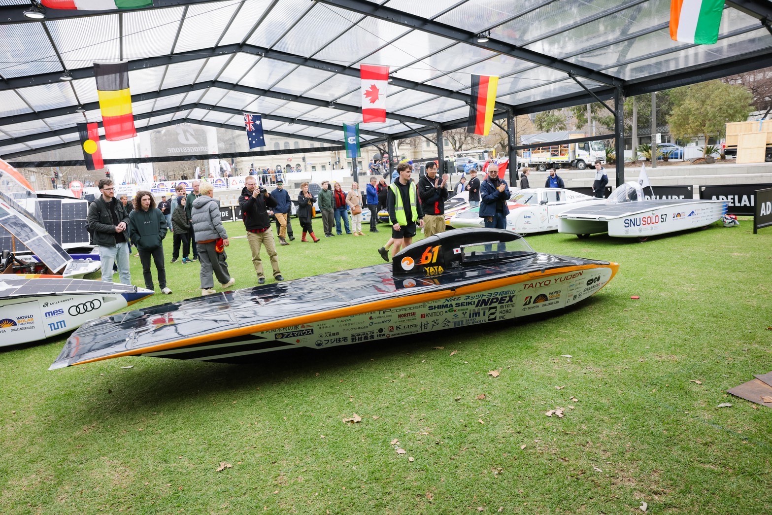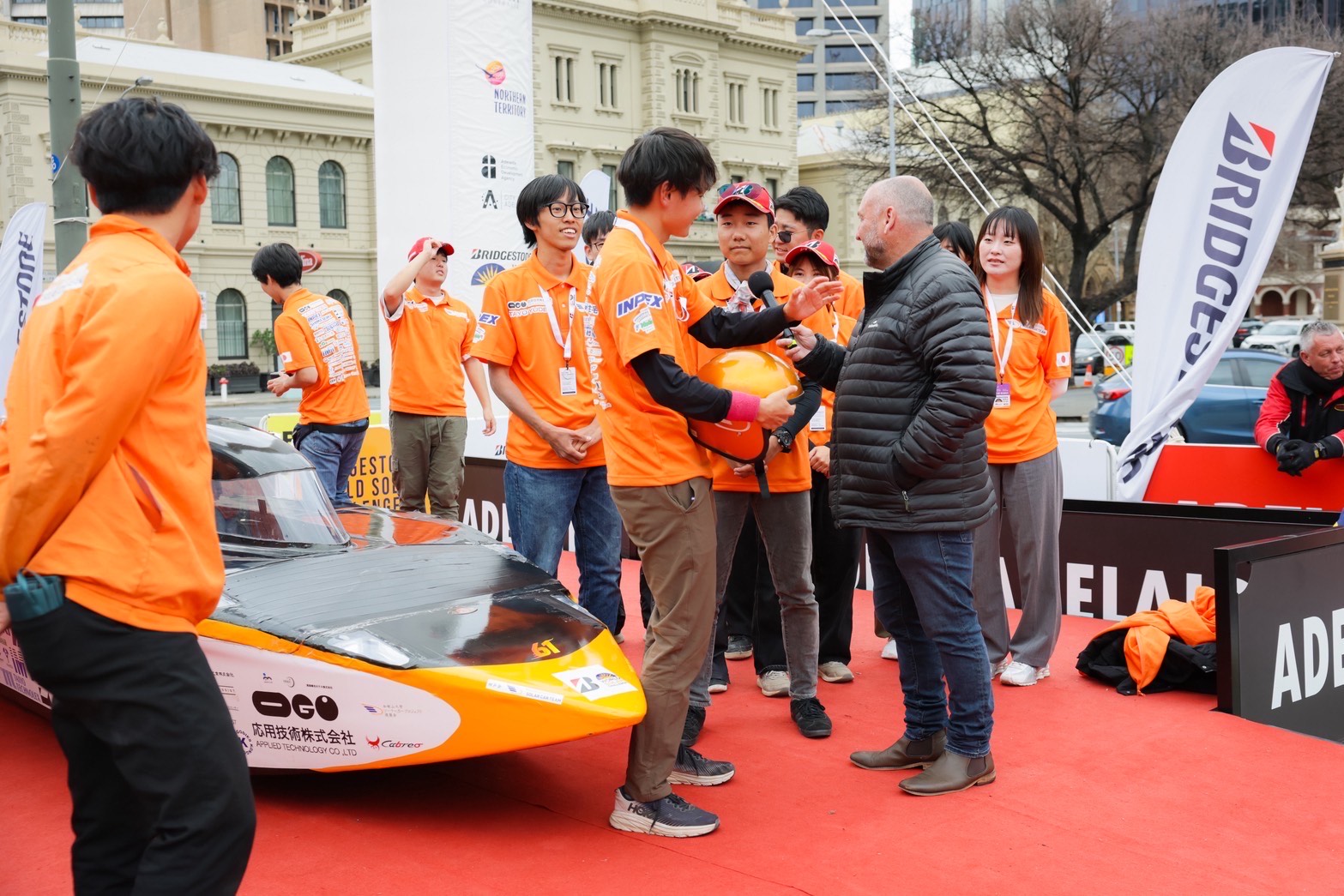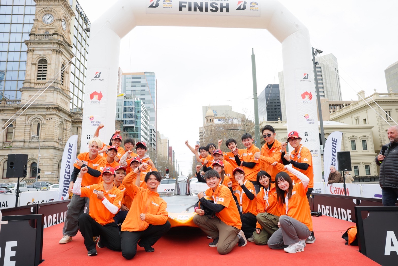 今日はアデレードでのゴールセレモニーに参加しました。 昨日レース中に応急処置で補修した車体を午前中からきれいに修復しなおし、レースの完走は叶いませんでしたがチーム全員のアデレード到着を讃えてフィニッシュラインにてゴールセレモニーをおこないました。 車両の保管場所から市街地をソーラーカーで走行して会場のビクトリースクエアまで向かい、フィニッシュラインでは他チームや観客のみなさんから歓声を受けました。 インタビューで代表の学生は、司会者からここに立ってみてどう思うかと聞かれ「完走できなかったことは悔しいが、前回の出場よりも大幅に記録を伸ばせたことは誇りに思う」と答えていました。 その後はゴール会場に集まっている各チームのソーラーカーを見学しながら、レース前には教えてもらえなかったことも含めて様々な情報収集をおこないました。