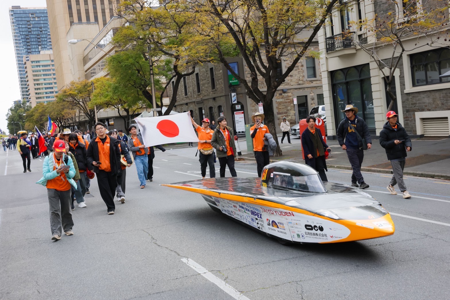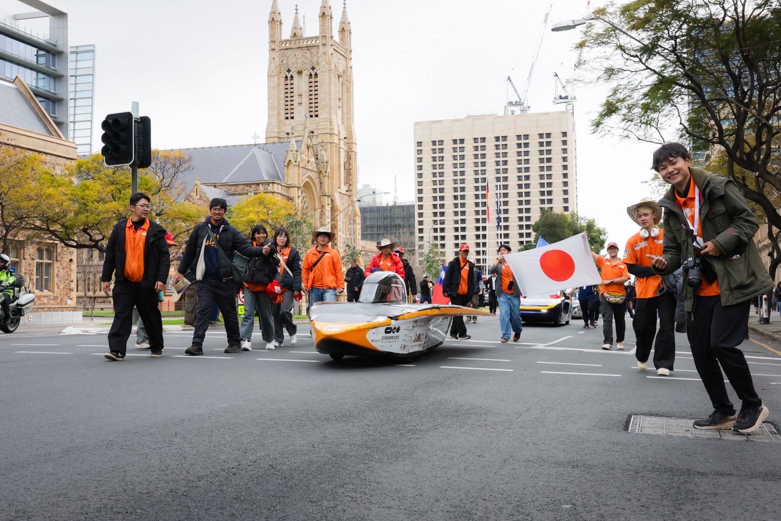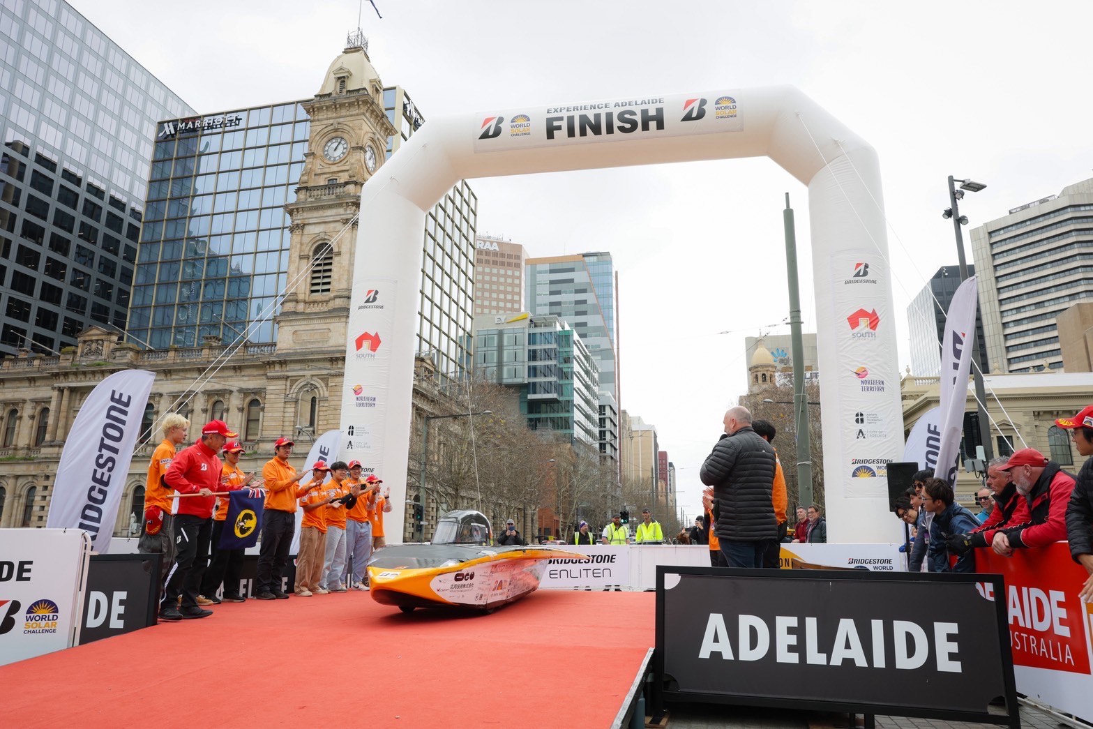 今日はアデレードでのゴールセレモニーに参加しました。 昨日レース中に応急処置で補修した車体を午前中からきれいに修復しなおし、レースの完走は叶いませんでしたがチーム全員のアデレード到着を讃えてフィニッシュラインにてゴールセレモニーをおこないました。 車両の保管場所から市街地をソーラーカーで走行して会場のビクトリースクエアまで向かい、フィニッシュラインでは他チームや観客のみなさんから歓声を受けました。 インタビューで代表の学生は、司会者からここに立ってみてどう思うかと聞かれ「完走できなかったことは悔しいが、前回の出場よりも大幅に記録を伸ばせたことは誇りに思う」と答えていました。 その後はゴール会場に集まっている各チームのソーラーカーを見学しながら、レース前には教えてもらえなかったことも含めて様々な情報収集をおこないました。