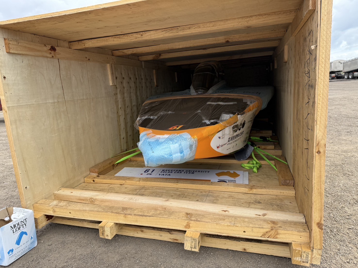 本日は、日本への輸送のためにソーラーカーや物品の荷渡しをおこないました。 経費を節約するために、オーストラリアへ運んできた際の木枠を再利用して梱包をおこないました。 再び日本で『YATA』に会えるのは数ヶ月後になるため、輸送時に破損しないように丁寧に梱包して引き渡しました。 これでオーストラリアですべき作業はひと通り終えて、あとはレンタカーやホテルの各自の手荷物を片付けて帰国の準備を残すのみとなりました。