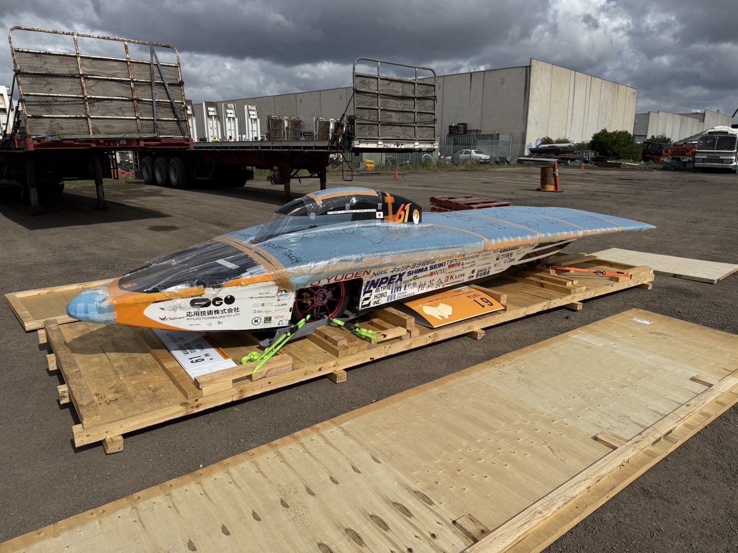 本日、無事検疫を通過しまして、明日にもソーラーカーを受け取れることになりました。 車検開始まで短い期間になってしまいましたが、明日から集中してマシン整備にあたっていきます。 - 2025年8月13日
