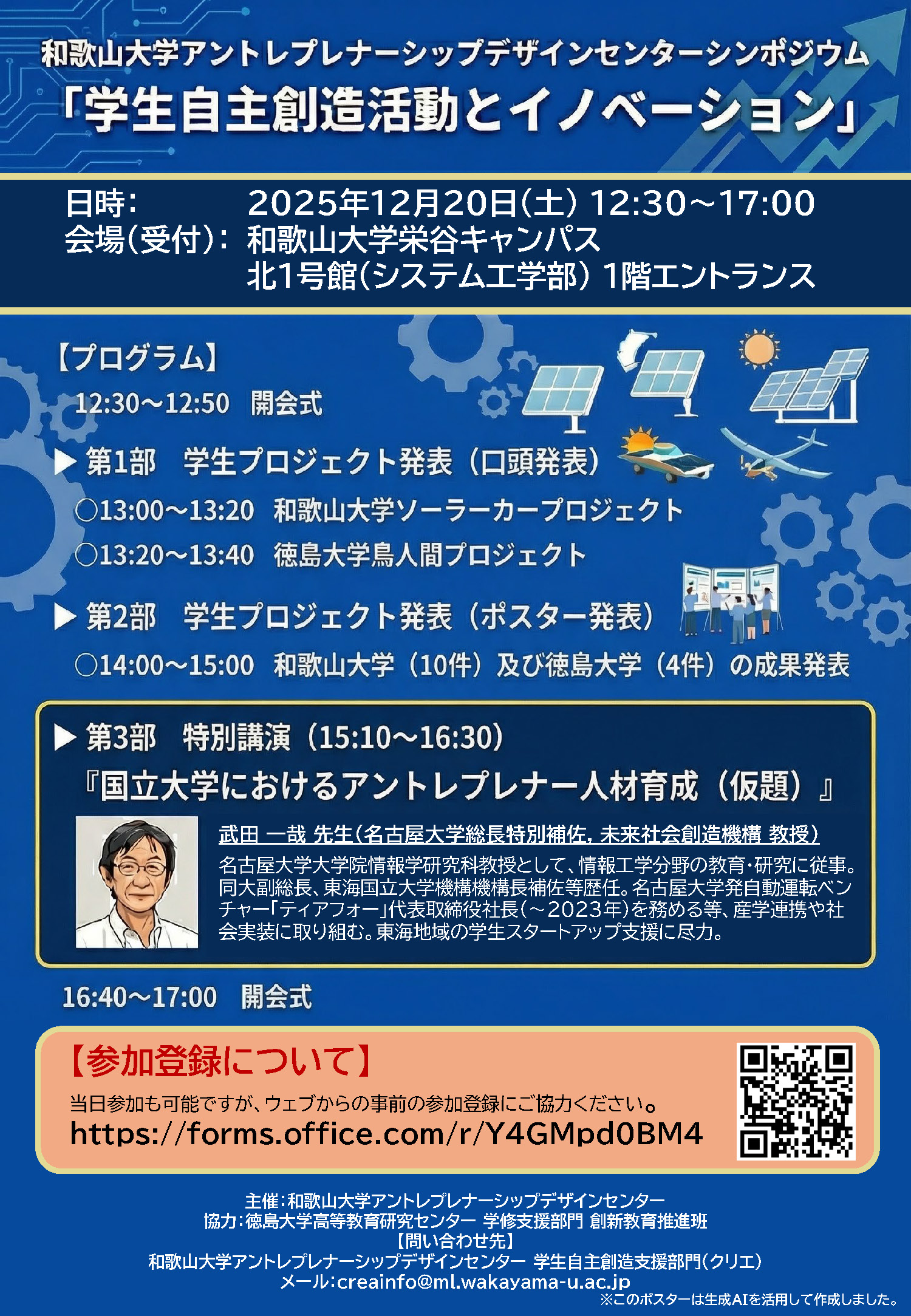 【2025年12月20日(土)開催】和歌山大学アントレプレナーシップデザインセンターシンポジウム 「学生自主創造活動とイノベーション」の開催について