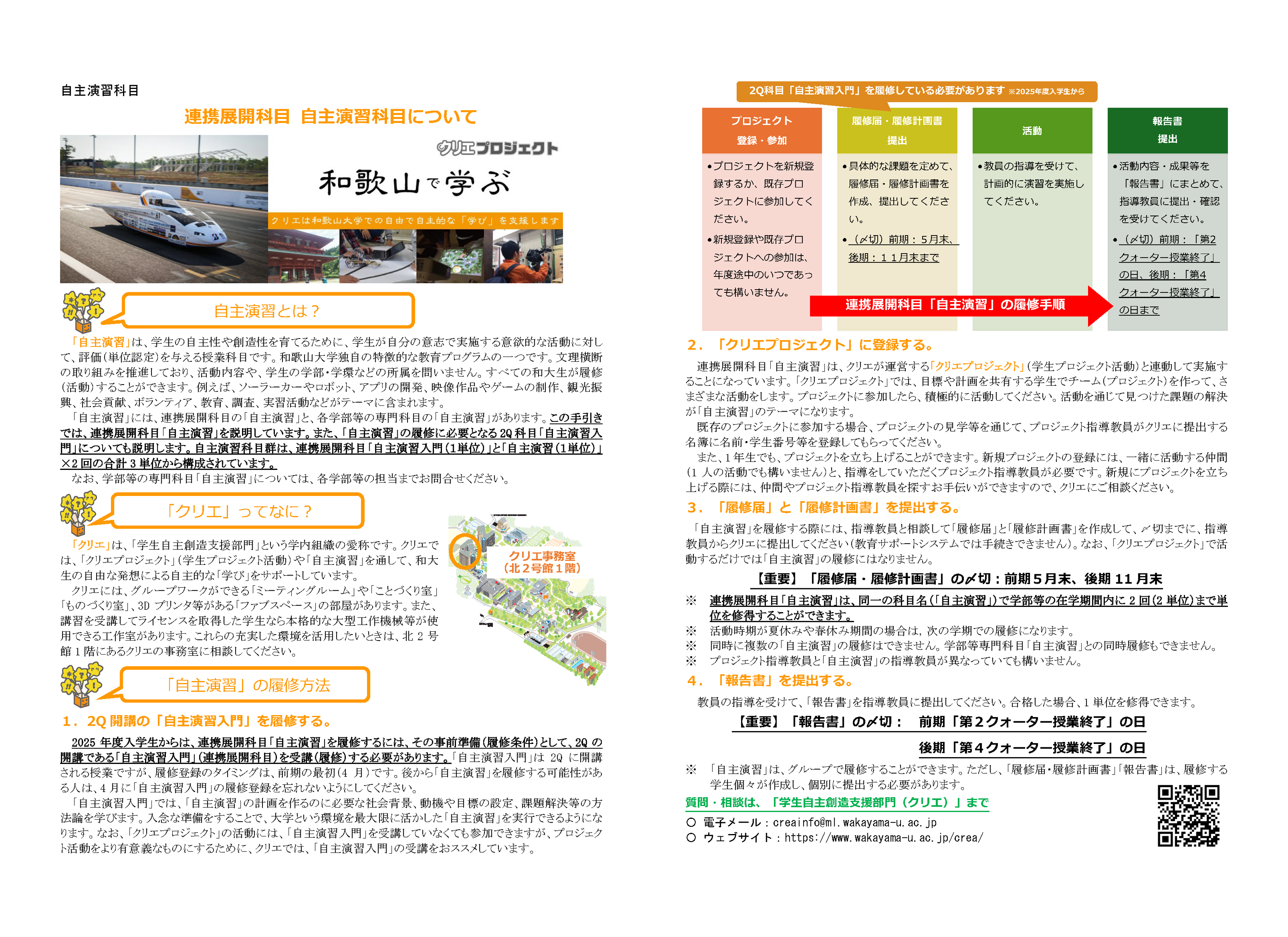 2025年度入学生から「自主演習」を履修するには、2Q開講の「自主演習入門」(火2限)を履修してことが条件になりました(必履修)。自主演習をする(クリエプロジェクトの活動を通じて単位を修得する)予定がある人は、4月頭の履修登録期間内に「自主演習入門」の受講登録を先に済ませておいてください。4月に「自主演習入門」の受講登録をしておかないと、その年度は、「自主演習」を実施することはできません(クリエプロジェクトとしての活動は履修していなくても可能です)。