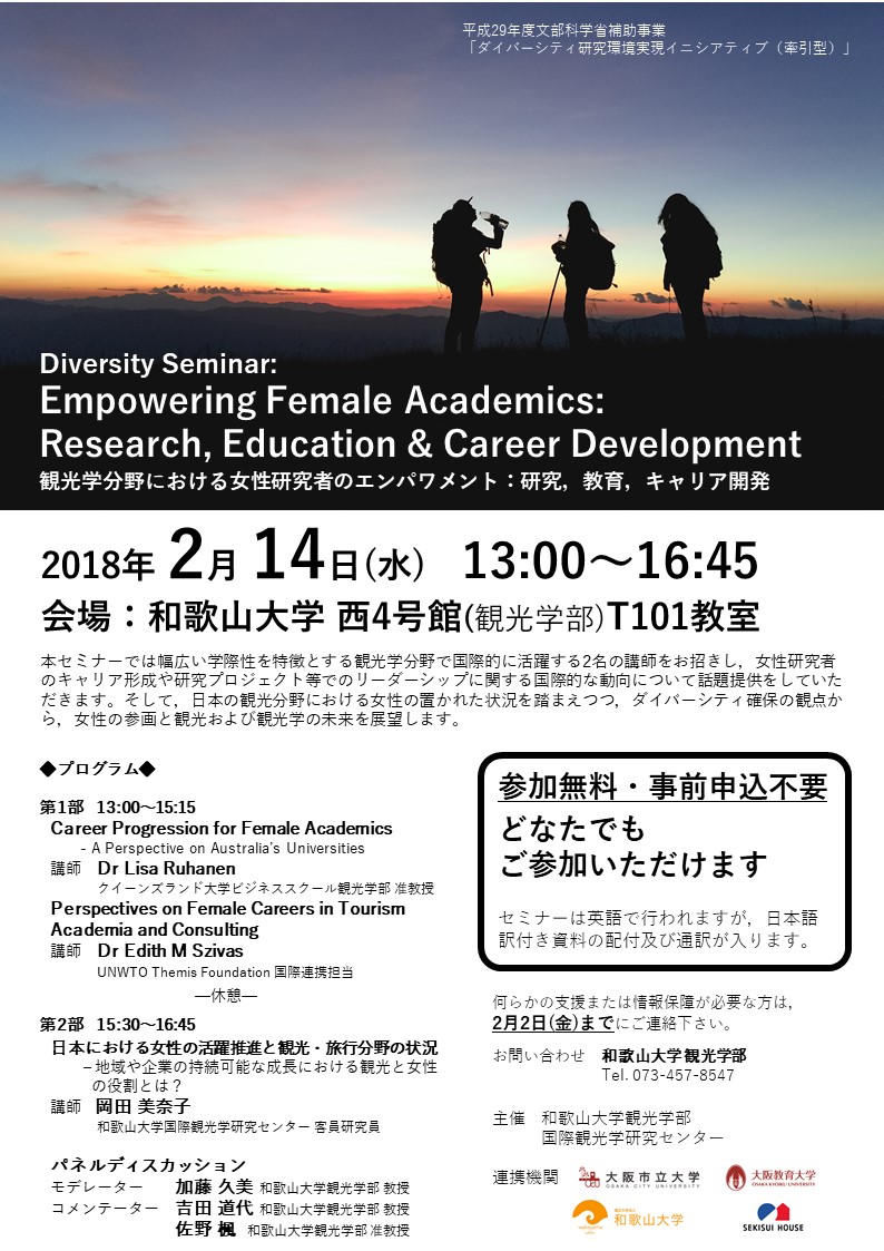 2/14(水)13時~開催!Diversity Seminar「観光学分野における女性研究者のエンパワメント:研究,教育,キャリア開発」