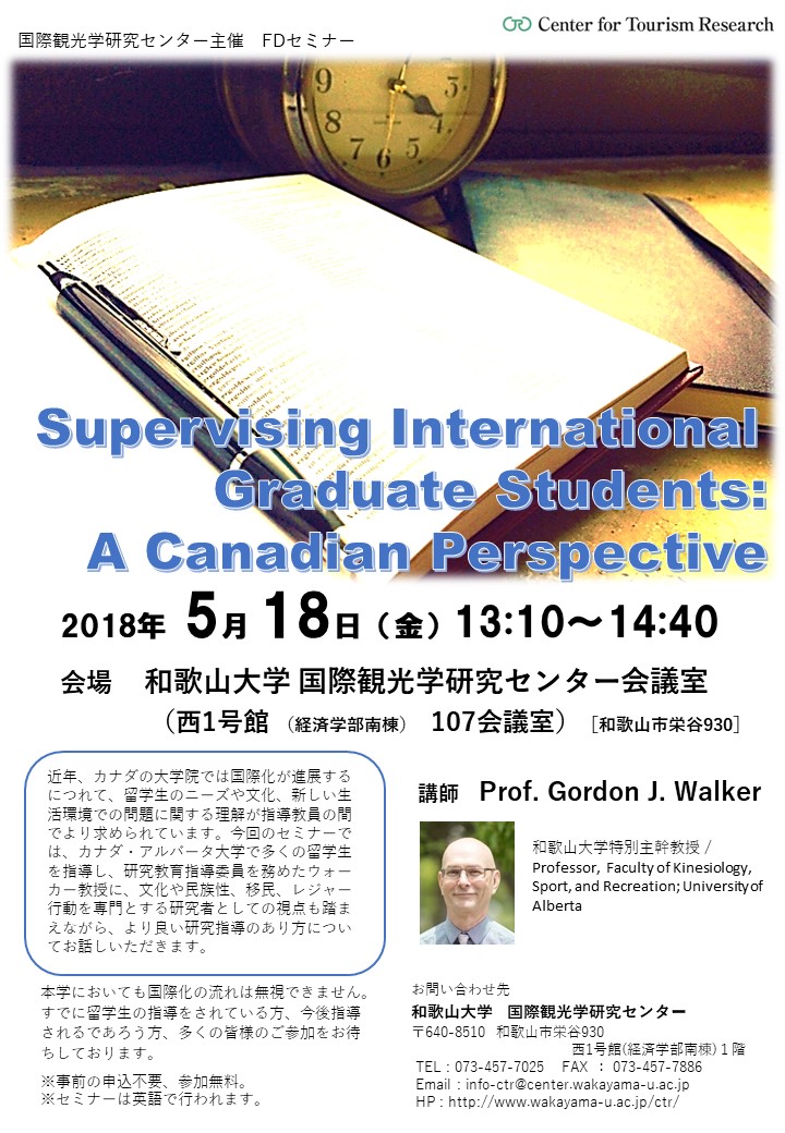 国際観光学研究センター(CTR)では、本学特別主幹教授のウォーカー教授を講師に、FDセミナー「Supervising International Graduate Students: A Canadian Perspective」を開催いたします。