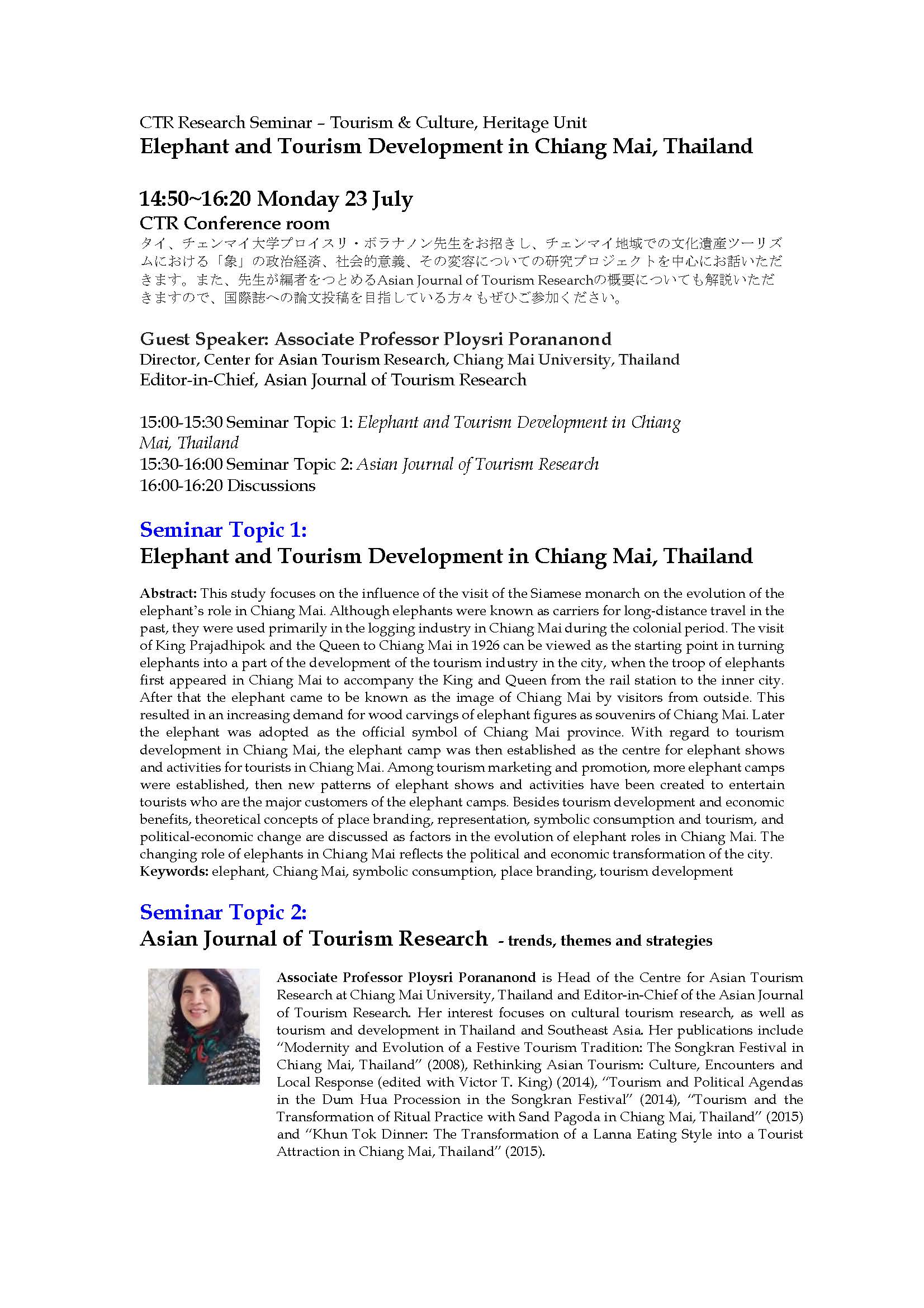 タイ、チェンマイ大学プロイスリ・ボラナノン先生をお招きし、チェンマイ地域での文化遺産ツーリズムにおける「象」の政治経済、社会的意義、その変容についての研究プロジェクトを中心にお話いただきます。