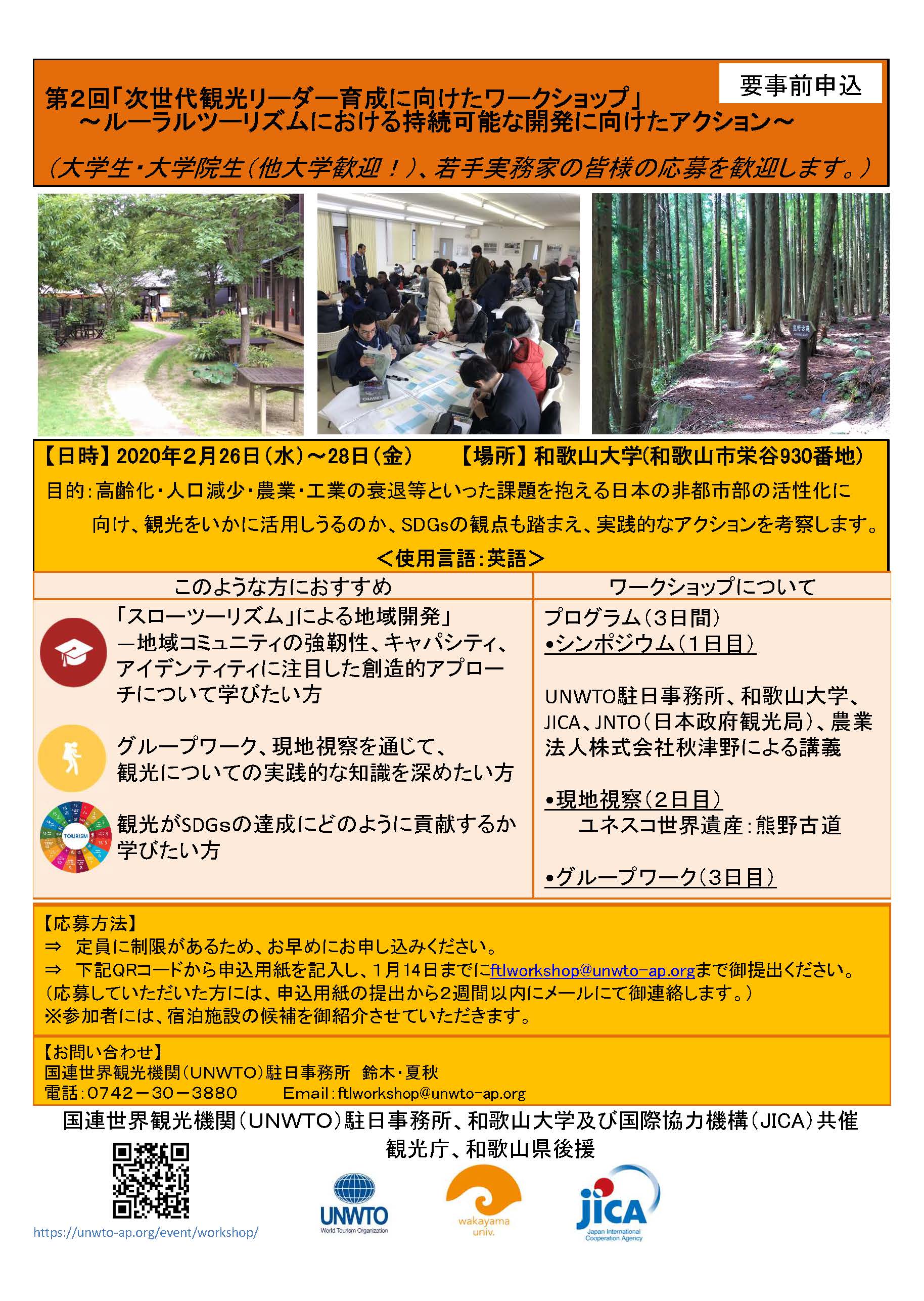 和歌山大学では、国連世界観光機関(UNWTO)駐日事務所および独立行政法人国際協力機構(JICA)との共催で、第2回「次世代観光リーダー育成に向けたワークショップ」を開催します。