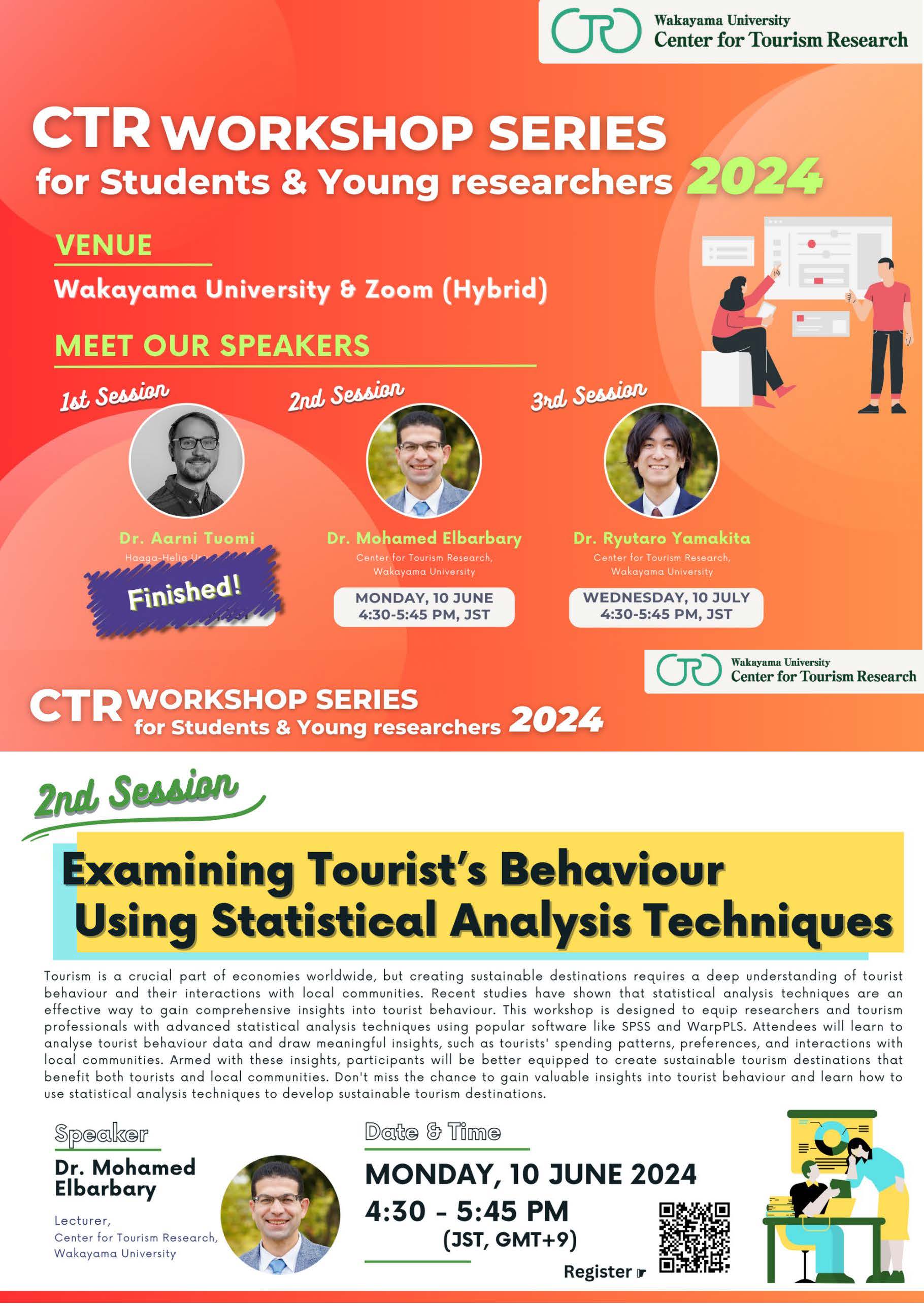 第2回は「Examining Tourist’s Behaviour Using Statistical Analysis Techniques」と題し、CTR教員であるモハメド・エルバルバリ講師が登壇し、観光客の消費パターンや嗜好、地域コミュニティとの相互作用に関する洞察を導き出す方法として、SPSSやWarpPLSなどのソフトウェアを用いた観光客の行動データの統計分析手法について紹介します。