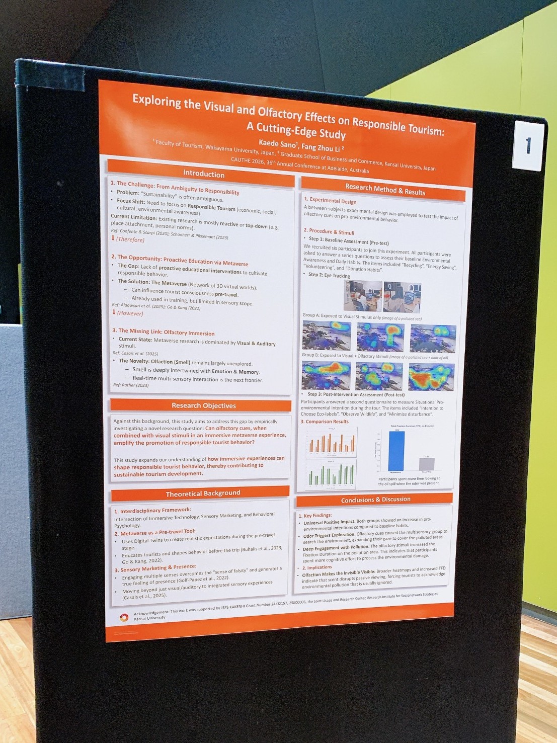 2026年2月9日〜12日、オーストラリア・アデレードで開催されたThe Council for Australasian Tourism and Hospitality Education (CAUTHE) 2026, The 36th Annual Conferenceにおいて、本学国際観光学研究センター(CTR)の佐野 楓教授(観光学部)および関西大学の李 芳洲氏による研究発表が、ベストポスター賞(Best Poster Award)に選出されました。