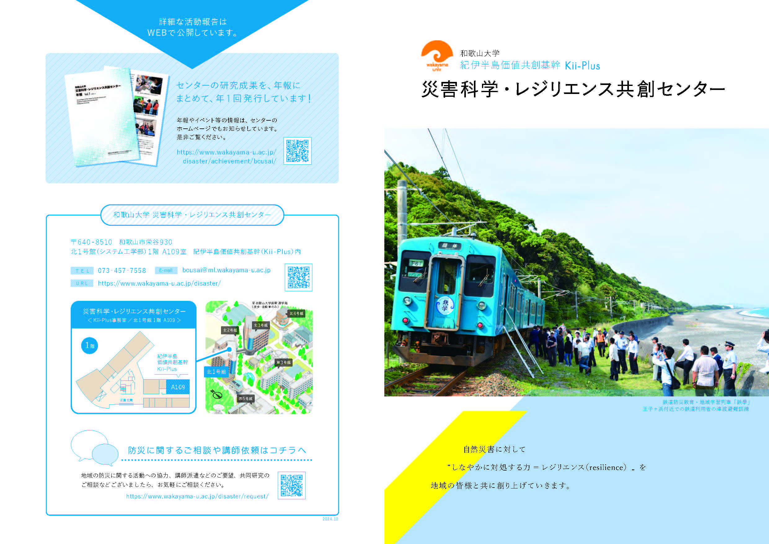 パンフレット ツイート 災害科学・レジリエンス共創センター パンフレット(令和6年10月改)は、こちらからダウンロードできます 令和6年9月20日事務室が移転。北1号館(システム工学部棟)1階 109室 紀伊半島価値共創基幹(Kii -Plus)内となりました。