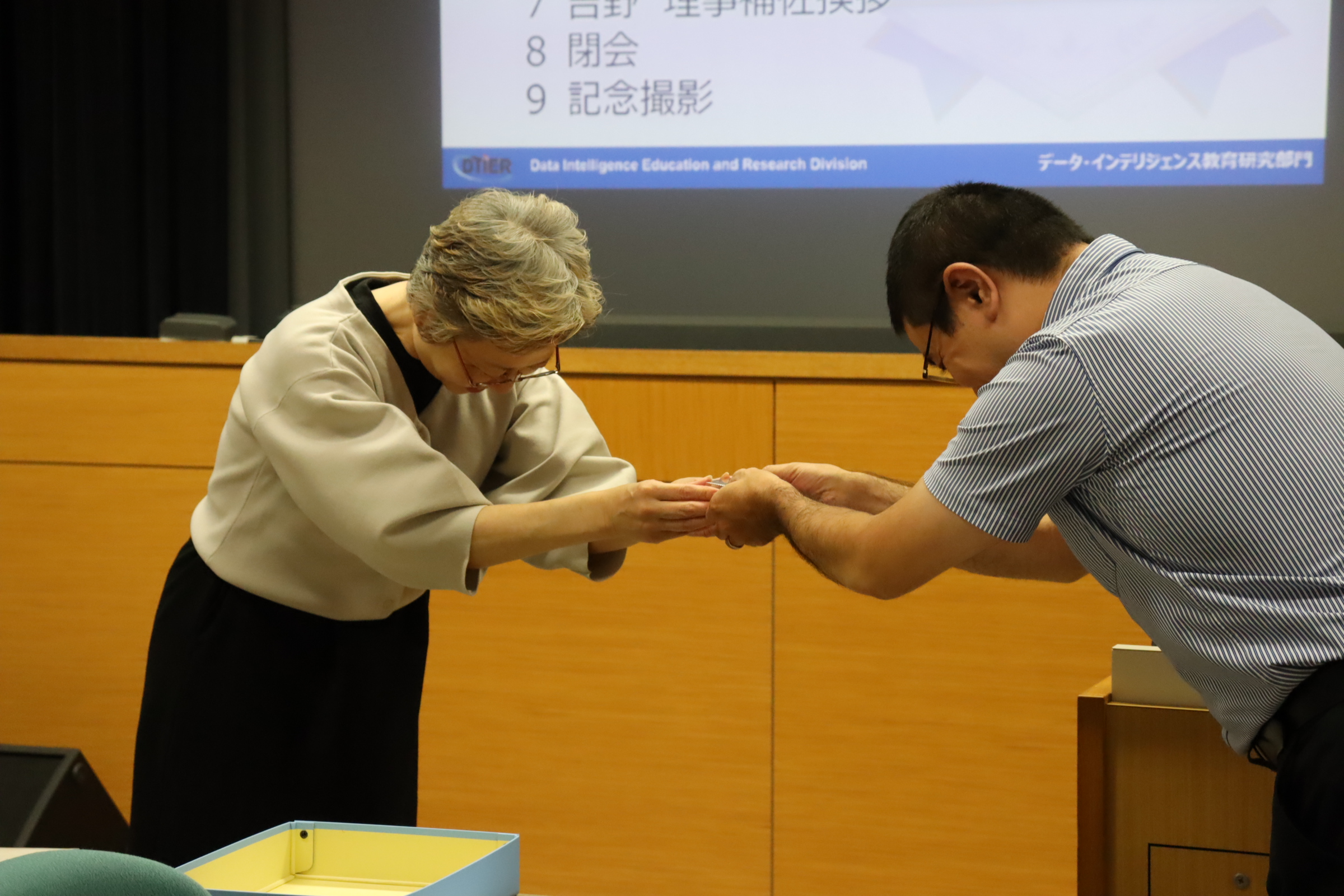 本日ご出席の皆さん、本当によく頑張りました。途中で脱落する事なく対象10単位を全て取得した学生を労う意図も込めて、昨年度より電子データではないリアルのバッジを授与する式を執り行っています。この授与式に先立ち大学全体の運営を考える会議でも、データサイエンスのことが話題に上がりました。今回学んできたすべてのことは、今後皆さんの将来にとっても役に立つ経験だったと思います。私ももっと学生時代に学んでおけばよかったなと今更ながら思っているくらいです。