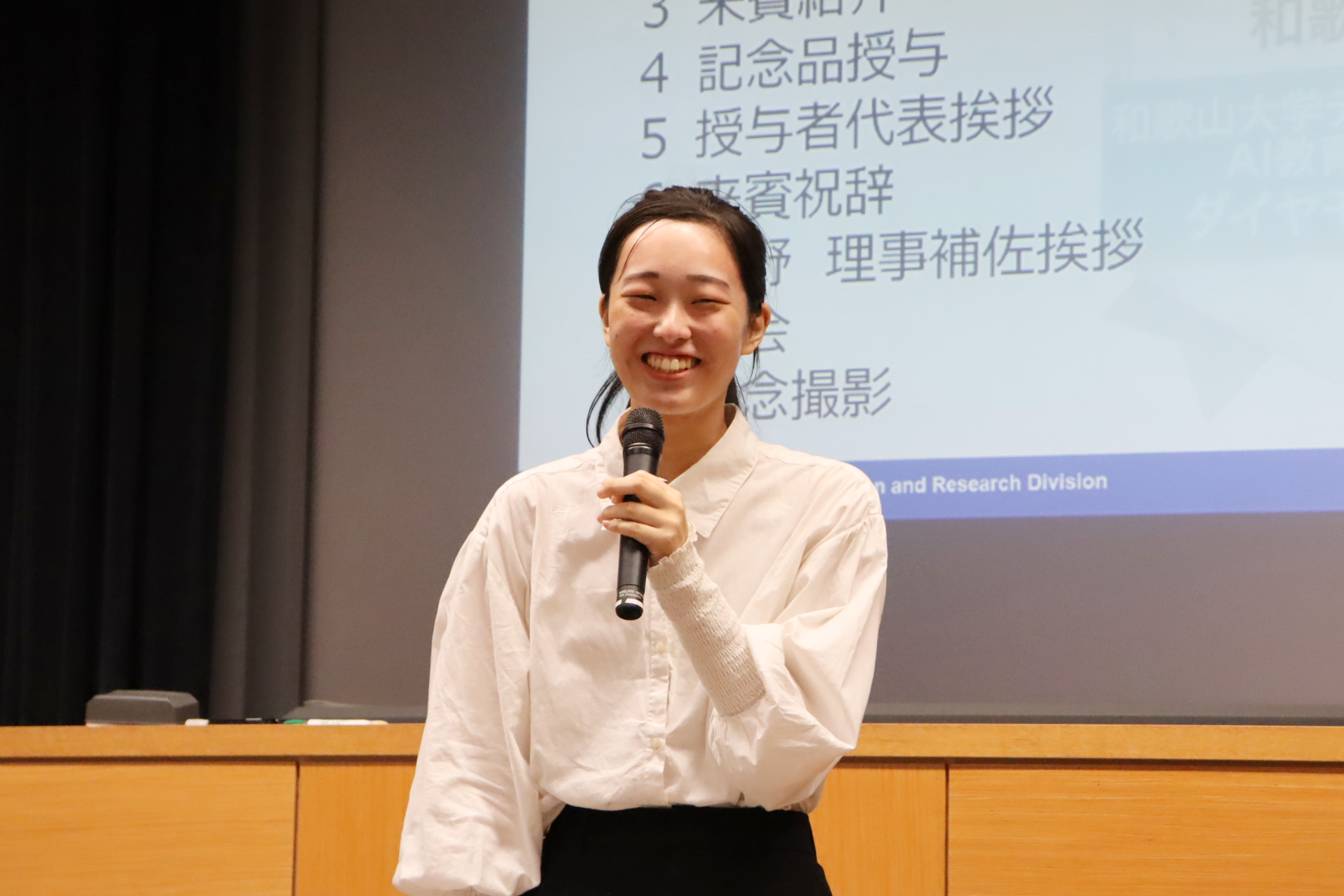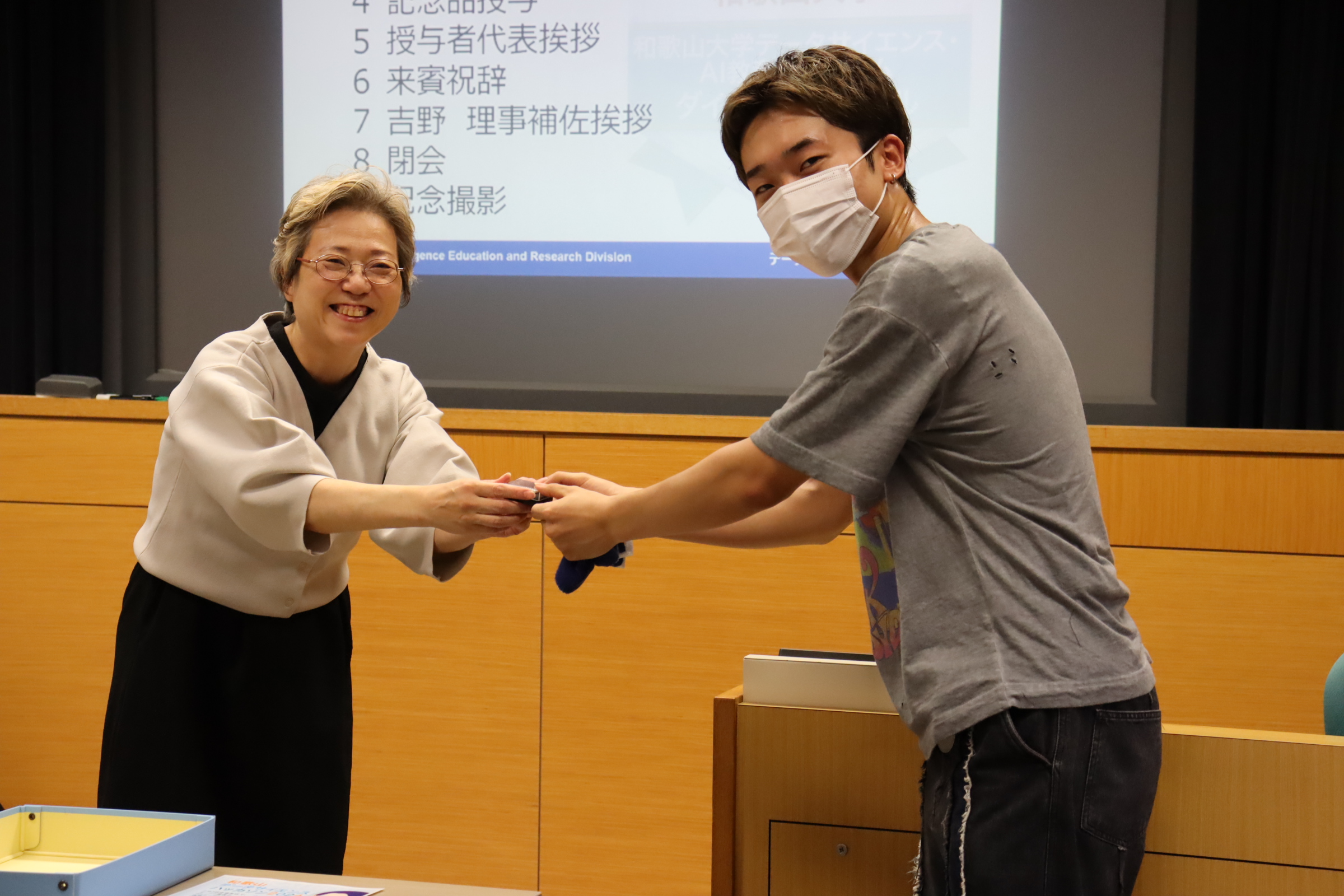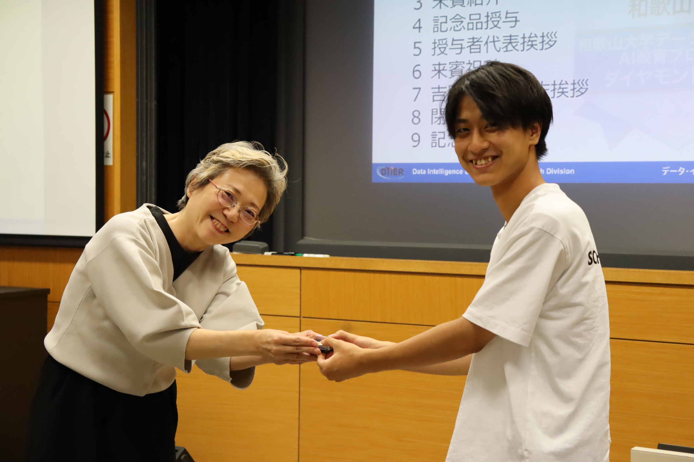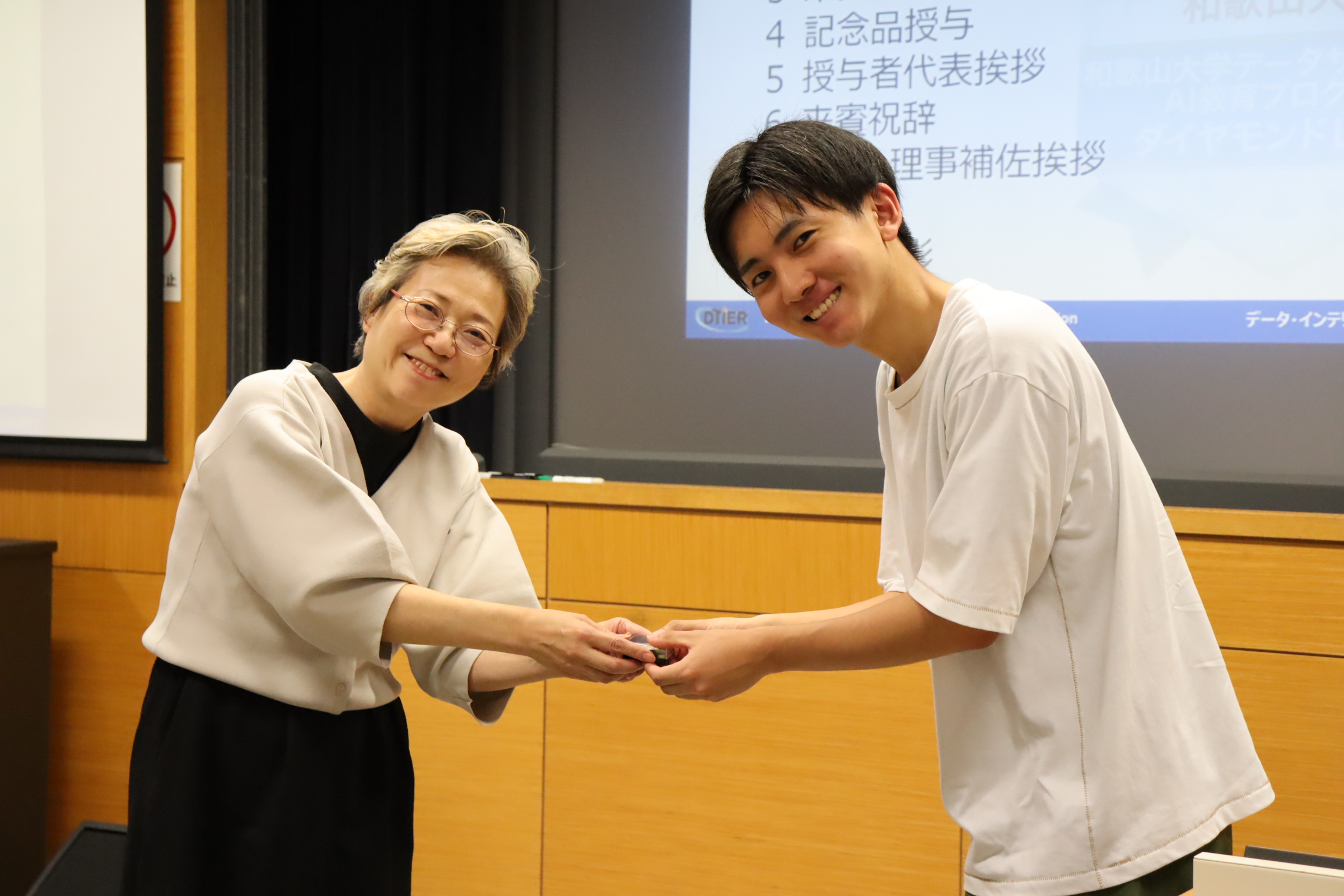 私は「データサイエンスへの誘い」から「データサイエンス入門」、「データサイエンス実践」と多くの授業を担当しているので、今回ダイヤモンドレベルバッジを授与された方の成長をすごく実感しています。1年生の時から勉強を始めるのですが、3年生になった時に学生さんたちにデータサイエンスの専門用語が通じるので、やっぱり教育って大事なんだなあと深く感じています。皆さんはまだあまり実感がないかもしれませんが、かなり成長しています。大学院でもデータサイエンスの授業が2科目あって、オークワさんや紀陽銀行さんのデータを扱う今よりもさらに高度な内容になります。もし進学することがあったらぜひ頑張ってくださいね。