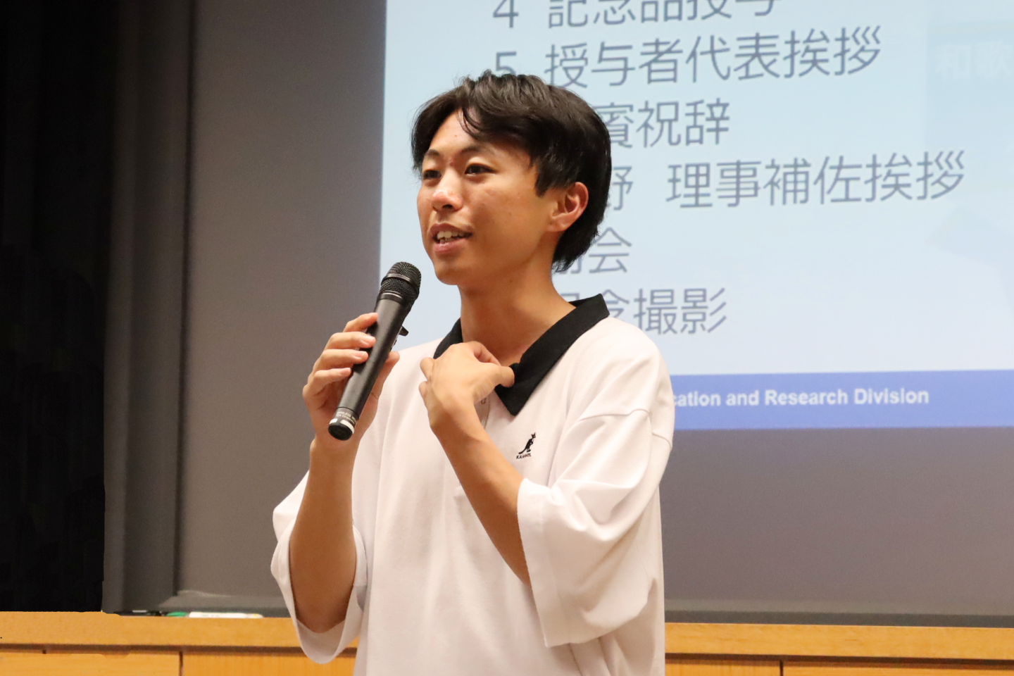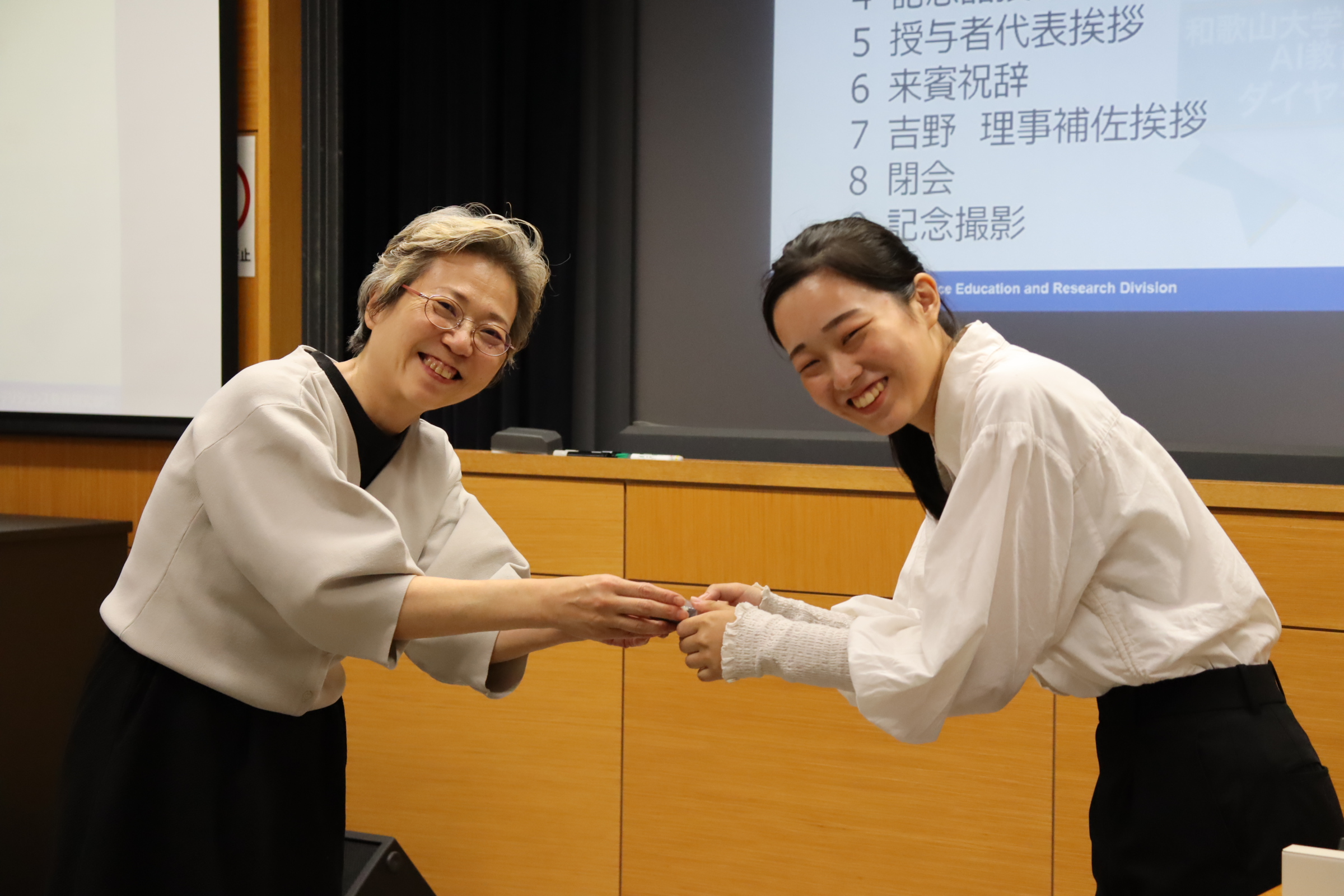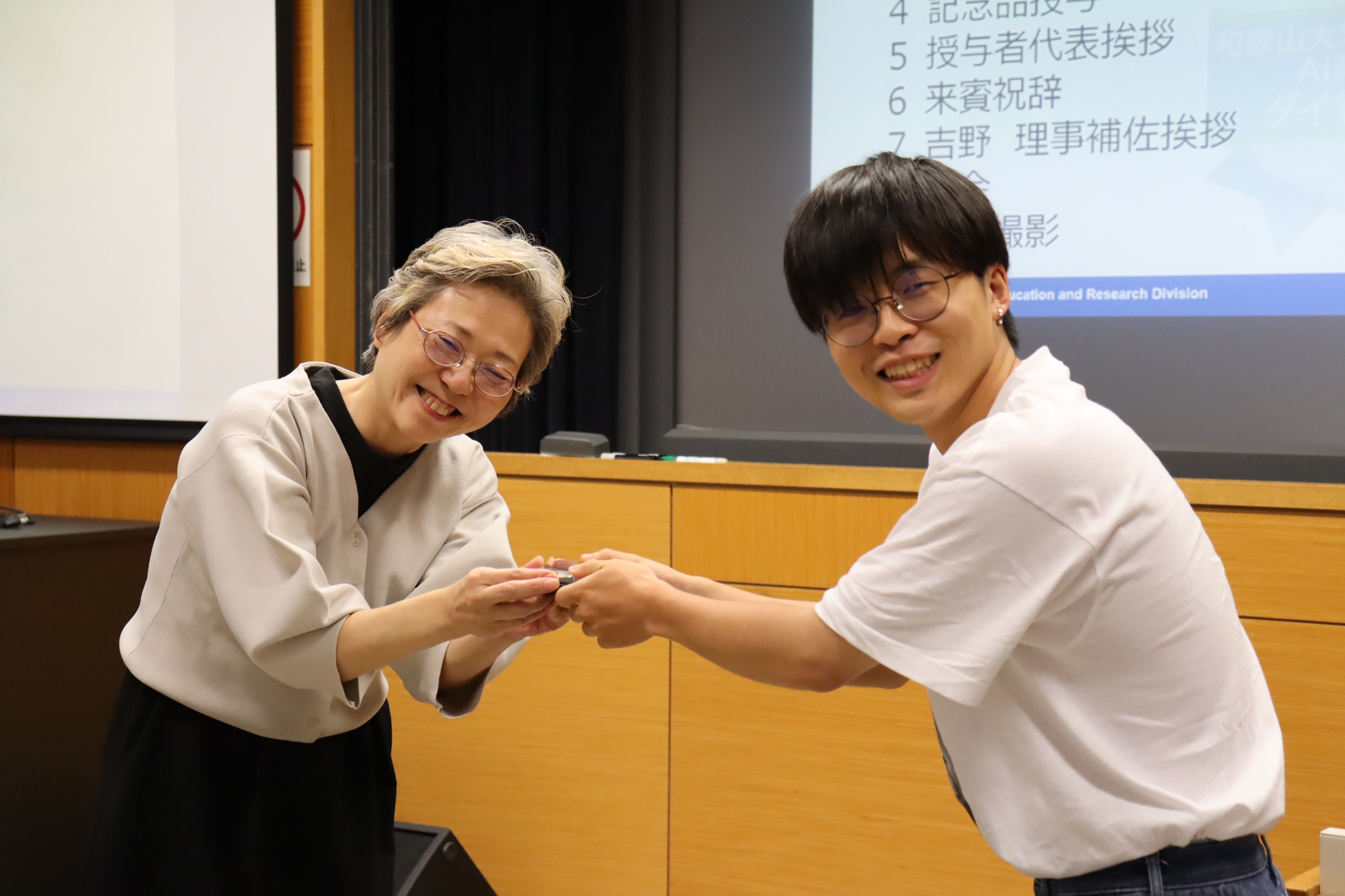 また今回授与した胸章という物理的なバッジもありますが、オープンバッジはデジタルバッジでもあり、一生皆さんの役に立ちます。ぜひ利活用してください。また、実はこのバッジを授与される方って和歌山大学ではわずか数パーセントなんです。皆さんよく頑張りましたね。これからの活躍を期待しています。