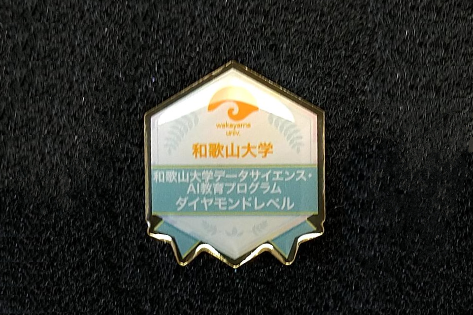 学生がデータサイエンス・AIの初歩的な知識に止まらず、応用から実践的な段階まで学修を継続することを奨励し、文理融合・分野横断型の学位プログラムを選択する学生の基盤を形成することを目的に、本教育プログラムのデータサイエンス・AIの科目群から10単位を修得した学生には、オープンバッジであるダイヤモンドレベルバッジと記念品(胸章)を授与しています。