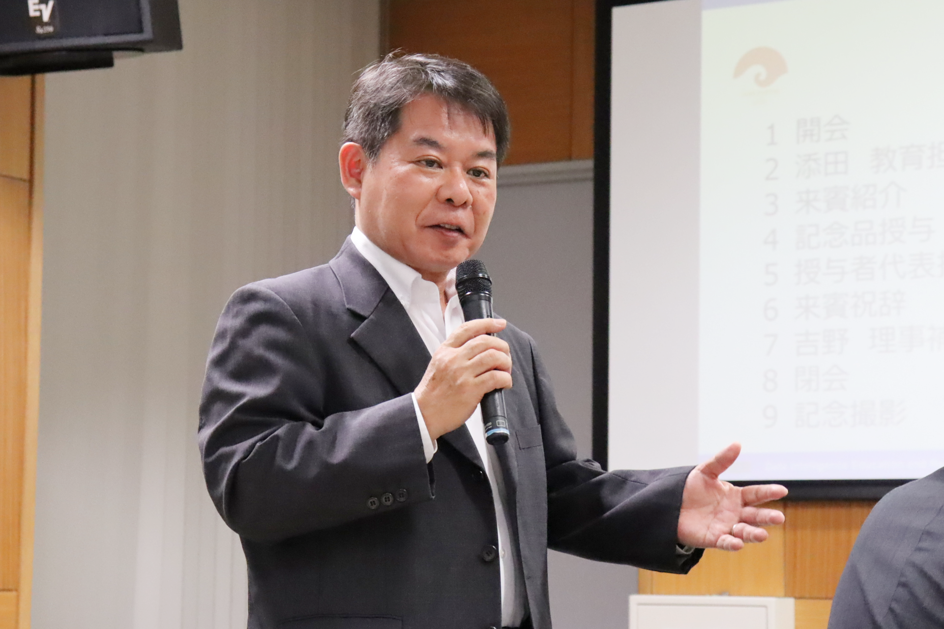 本学データサイエンス・AI科目開講にご協力いただいております、株式会社オークワ様、株式会社紀陽銀行様、株式会社サイバーリンクス様からもご来賓としてお越しいただきご祝辞をいただきました。