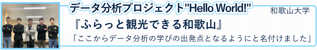2024年12月14日(土)に、第8回和歌山県データ利活用コンペティション(主催:和歌山県)の最終審査会・表彰式が、和歌山県データ利活用推進センターにて開催され、チーム「データ分析プロジェクト“Hello World!”」(社会インフォマティクス学環5名)が、最終審査のプレゼンテーションを行いました。