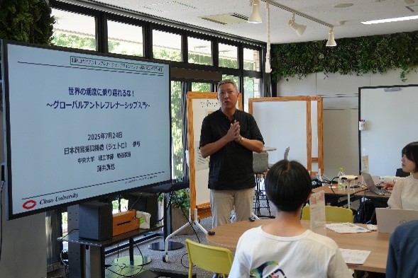 和歌山大学とJETROは、令和5年に締結した包括連携協定の取り組みの一環として、令和7年7月24日(木)、和歌山大学北4号館2階アントレルームにおいて、日本貿易振興機構参与藤井真也先生をお招きし、グローバルアントレプレナーシップに関する講演を開催しました。参加者は16名(学生7名(うち留学生2名)、本学教職員9名)。世界を舞台にビジネスを展開してきた藤井先生が、その面白さと難しさ、日本の立ち位置を国際的な視野で語り、その後のディスカッションでは、JETROの職員の方々も加わり、予定時間を超える白熱した議論が行われました。