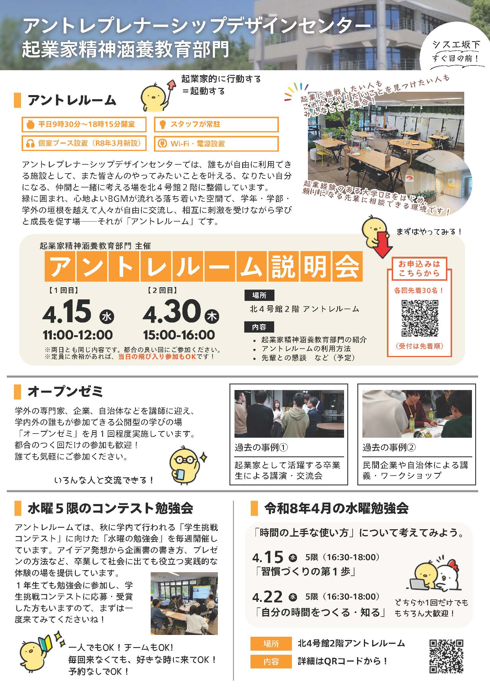 新入生のみなさん、4月の「起業家精神涵養教育部門主催 アントレルーム説明会」に参加してみませんか! クリックして拡大↓↓