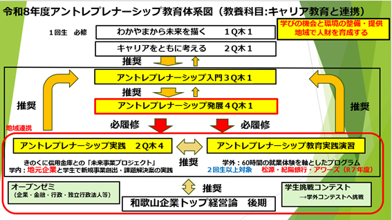アントレプレナーシップは、企業の経営課題だけでなく地域や社会の課題解決など、どんな環境でも役立つ普遍的な力です。和歌山大学では、この力を育てるために、キャリア教育とアントレプレナーシップ教育を連動させ、教養科目として全学的に推進しています。