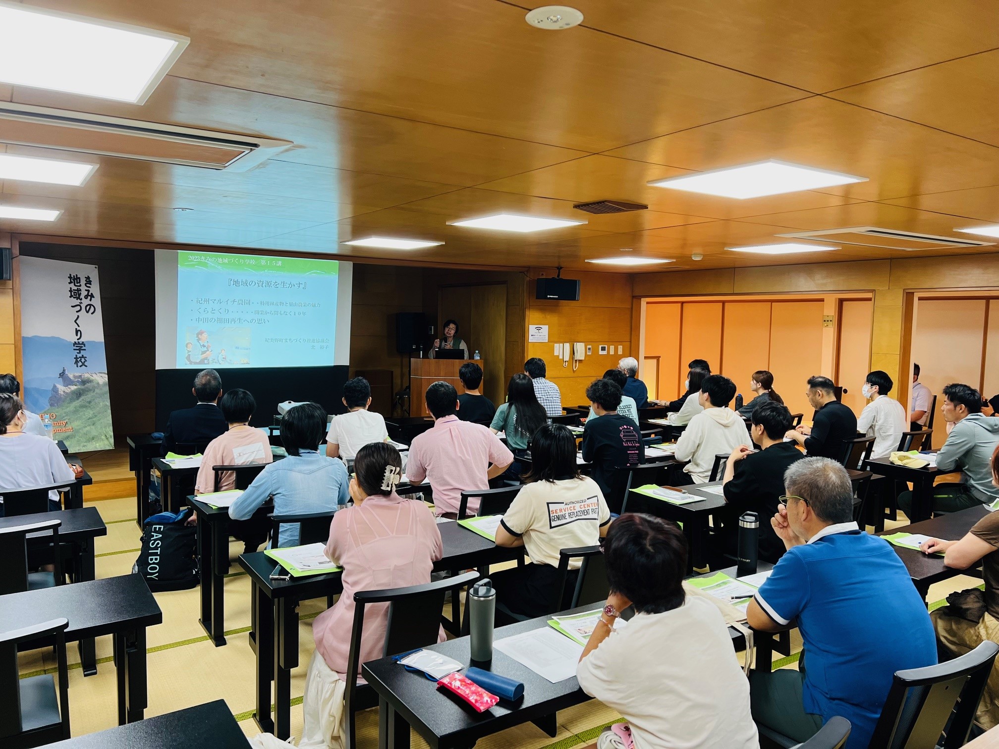 去る9月30日(土)・10月1日(日)、当センターと紀美野町の協働で開校した「きみの地域づくり学校」の第5回目講座が、紀美野町「かじか荘」にて開催されました。第1回目より40人を優に超える社会人&学生の受講者を迎え、教室に人が溢れかえる状況でしたが、今回は学内での新型コロナ流行のため高校生が欠席し、少し余裕を感じる座席状況でした。