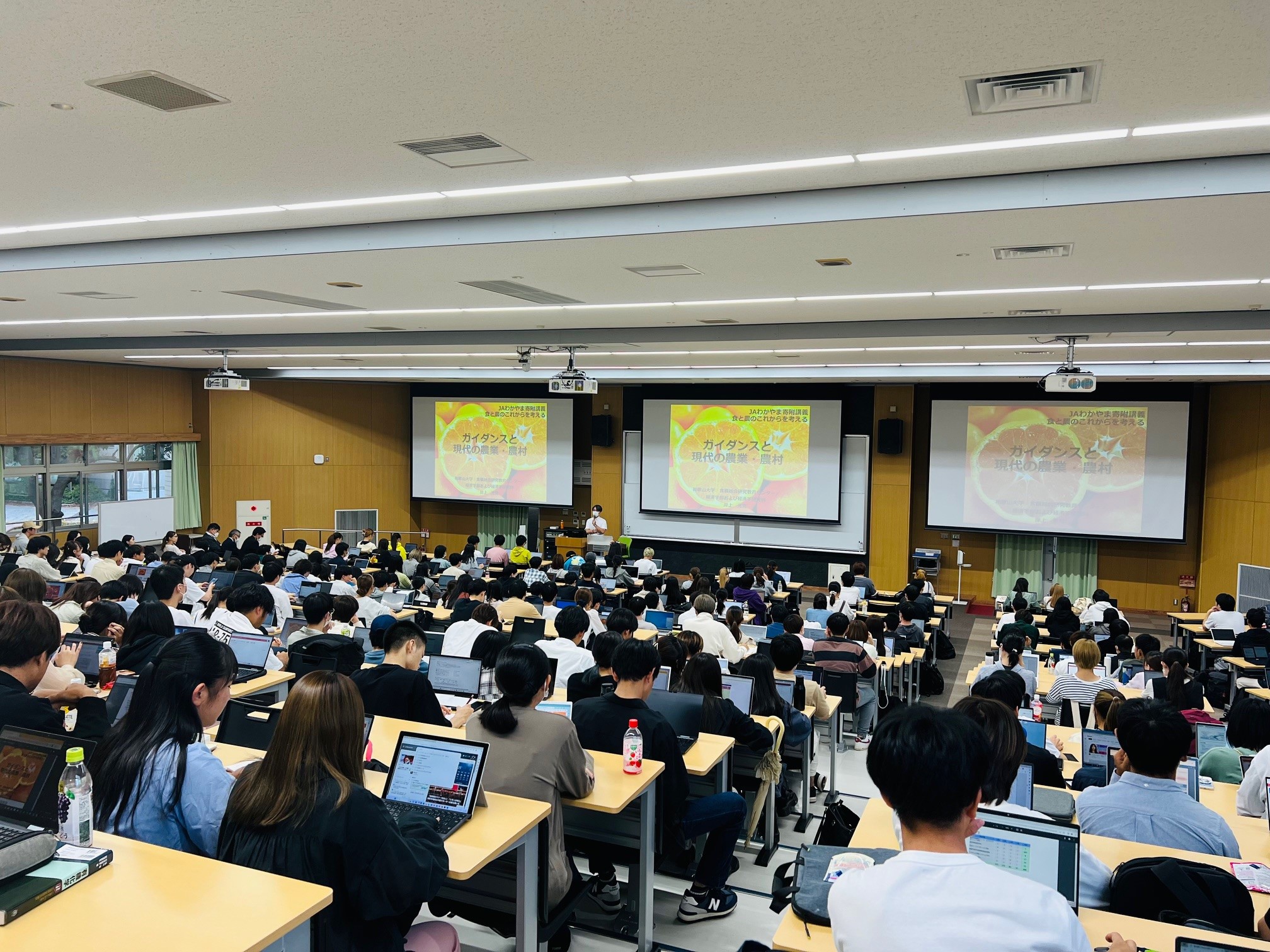 今年度からはコロナ禍制限もなくなり、学生だけで350人以上、高校生・社会人(JA関係、近畿農政局、役所関係等)で30人以上参加という延べ400人近くの受講者となっています。昨年までは150人程度に絞っていましたが、昨年の倍以上の参加人数で、大教室でも収容ギリギリという状況です。