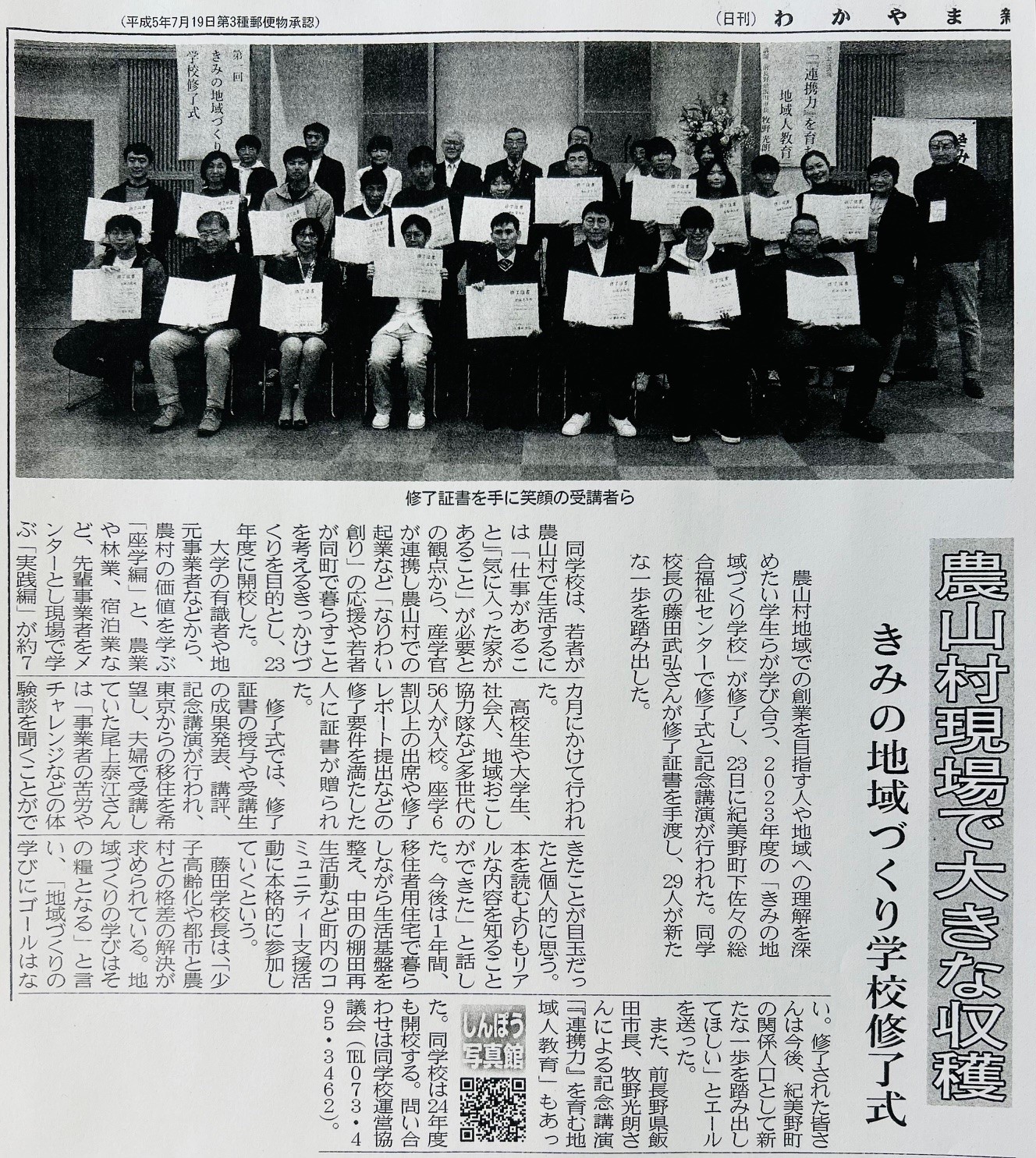 去る3月23日(土)、紀美野町にて「第1回きみの地域づくり学校」の修了式が開催されました。『わかやま新報』さんの記事を掲載させていただきますので、第2部の講演会・交流会の様子と併せて写真にてぜひご覧ください。